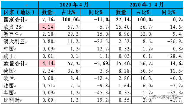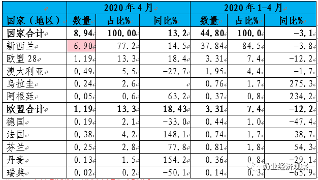 其中,从新西兰进口0.7万吨,占86.4%,同比增加5%,从欧盟进口0.09万吨,占10.4%。