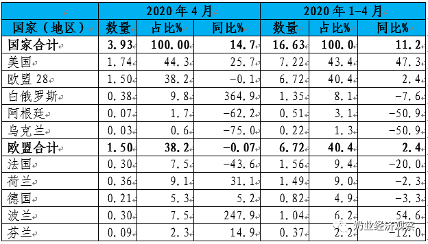 2020年1-4月我国共计出口各类乳制品13318.94吨,同比减少25.8%,出口额7722.09万美元,同比下降51.8%。4月我国共计出口各类乳制品3473.89吨,同比减少14.4%,出口额1534.56万美元,同比下降46.9%。