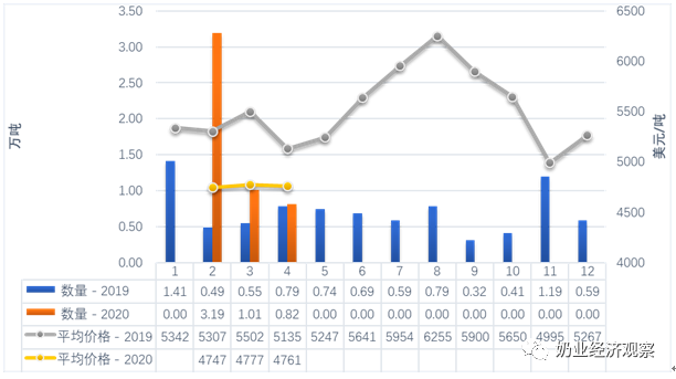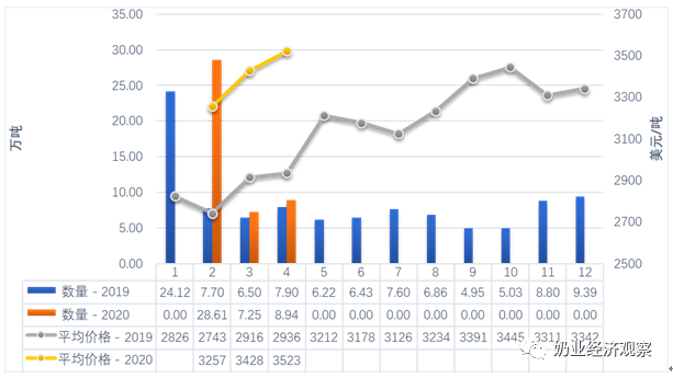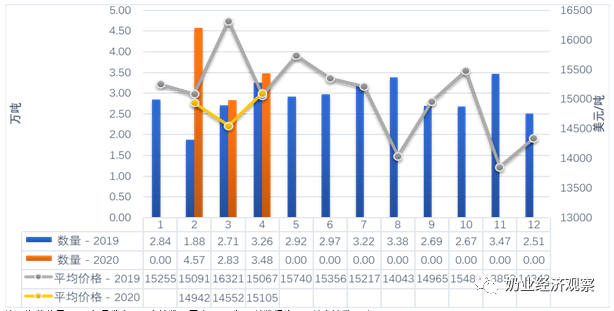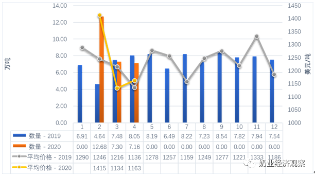 据中国海关统计,2020年1-4月中国共进口婴配10.88万吨,同比增加1.8%,进口额16.21亿美元,同比下降1.8%,平均价格为14893美元/吨,同比下降3.5%。