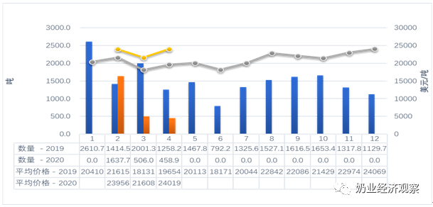 据中国海关统计,2020年1-4月中国共出口干乳制品4605.82吨,同比减少52.2%,出口额0.68亿美元,同比下降55.3%,平均价格为14695美元/吨,同比下降6.6%。