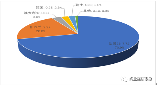 其中,从欧盟进口7.72万吨,占70.9%,同比增加3.5%,从新西兰进口2.27万吨,占20.8%,同比增加3.1%。