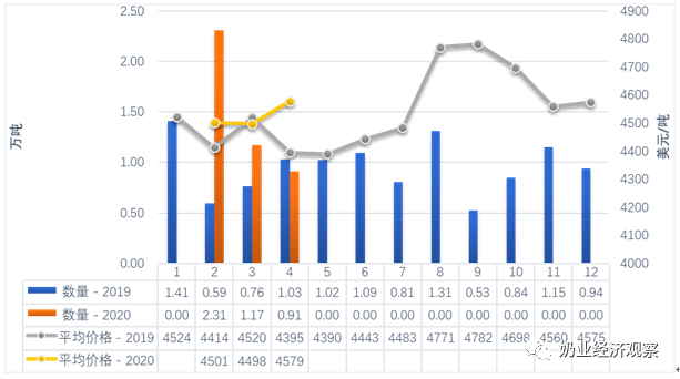 4月中国共进口酸奶0.28万吨,同比减少14%,进口额0.04亿美元,同比下降20.2%,平均价格为1555美元/吨,同比下降7.2%。