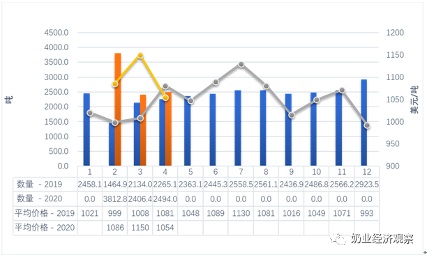 3.2.1 干乳制品1-4月出口-52.2%至4606吨