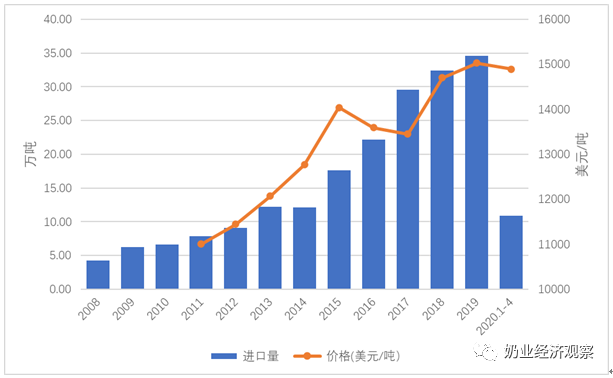据中国海关统计,2020年1-4月中国共进口奶酪4.39万吨,同比增加15.8%,进口额1.98亿美元,同比增长17%,平均价格为4517美元/吨,同比上涨1%。