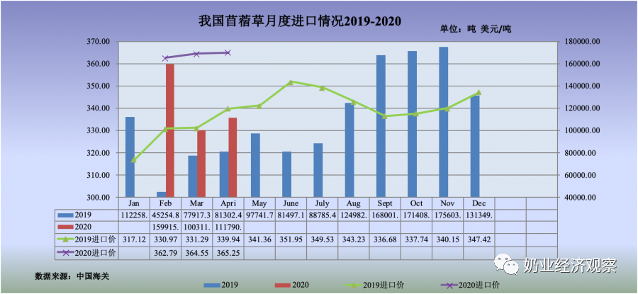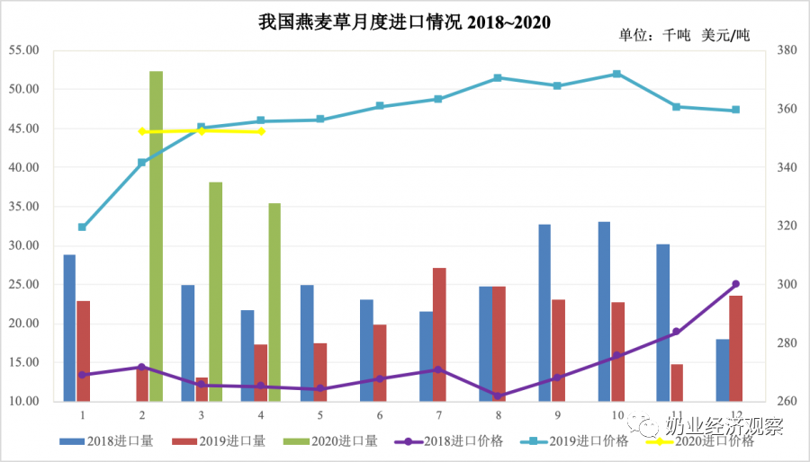 6.1.2 进口燕麦草:1-4月12.6万吨+86% 价格+2.5%至352美元/吨