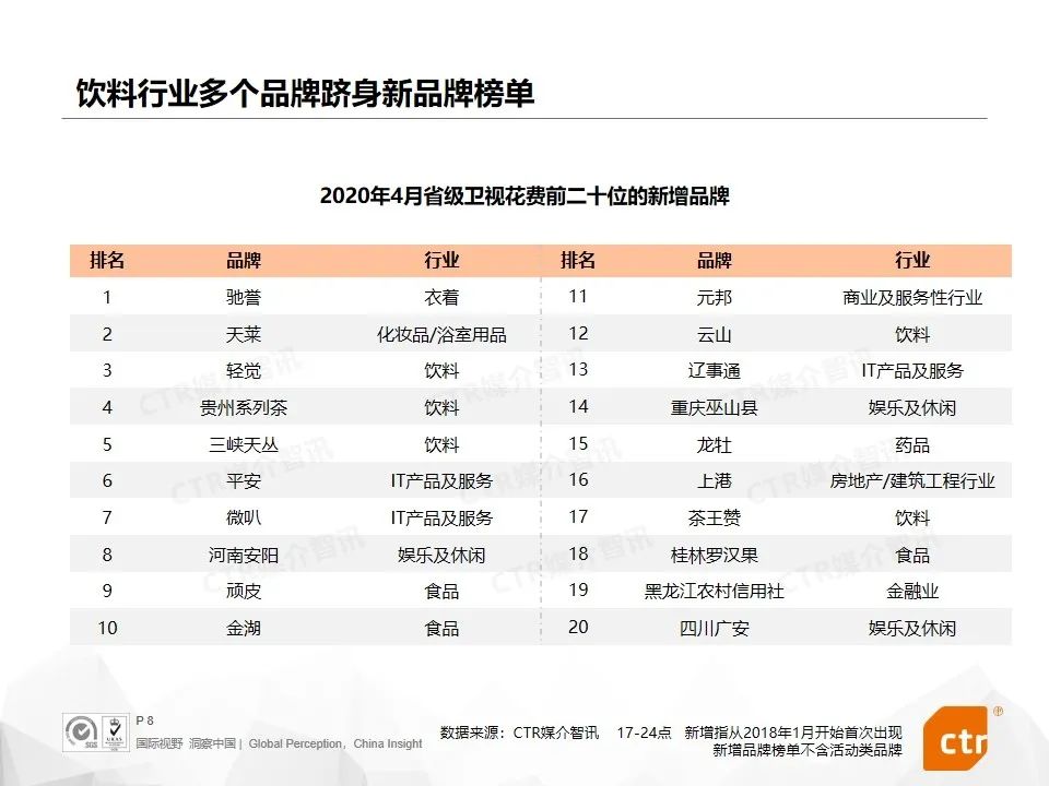 4月份省级卫视新增品牌中,有多个饮料行业品牌入榜。其中,大部分为茶叶品牌,一个为乳制品品牌。河南省花花牛乳业集团旗下的首款功能性酸奶品牌——轻觉,该品牌于4月在河南卫视投放大量广告,覆盖河南卫视的多类节目时段。