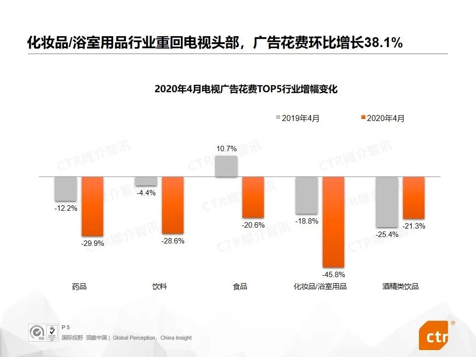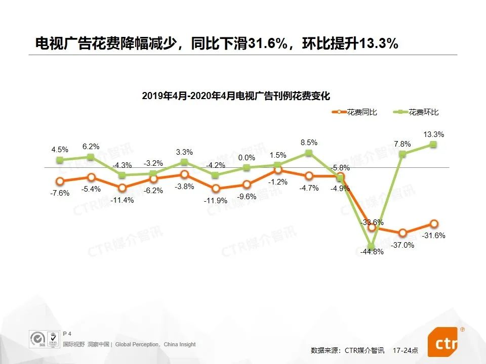 根据CTR媒介智讯的数据显示,2020年4月,电视广告刊例花费同比下滑31.6%,时长同比下滑35.5%。虽然电视广告整体仍旧受到疫情影响有所下滑,但与3月相比,刊例花费和时长环比均上涨13%左右。家用电器、IT产品及服务、清洁用品、衣着是4月份电视广告投放同比上涨的行业,但投放总量不大并没有位居电视榜单前列。电视广告头部行业中,化妆品/浴室用品行业重回榜单,广告花费同比下滑45.8%,但环比上涨明显。