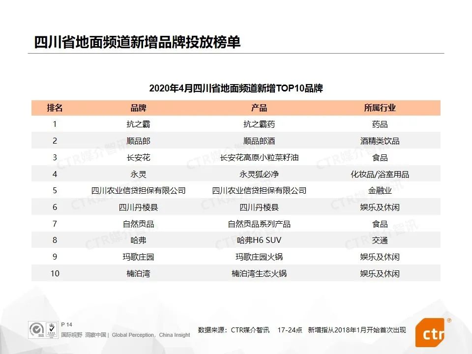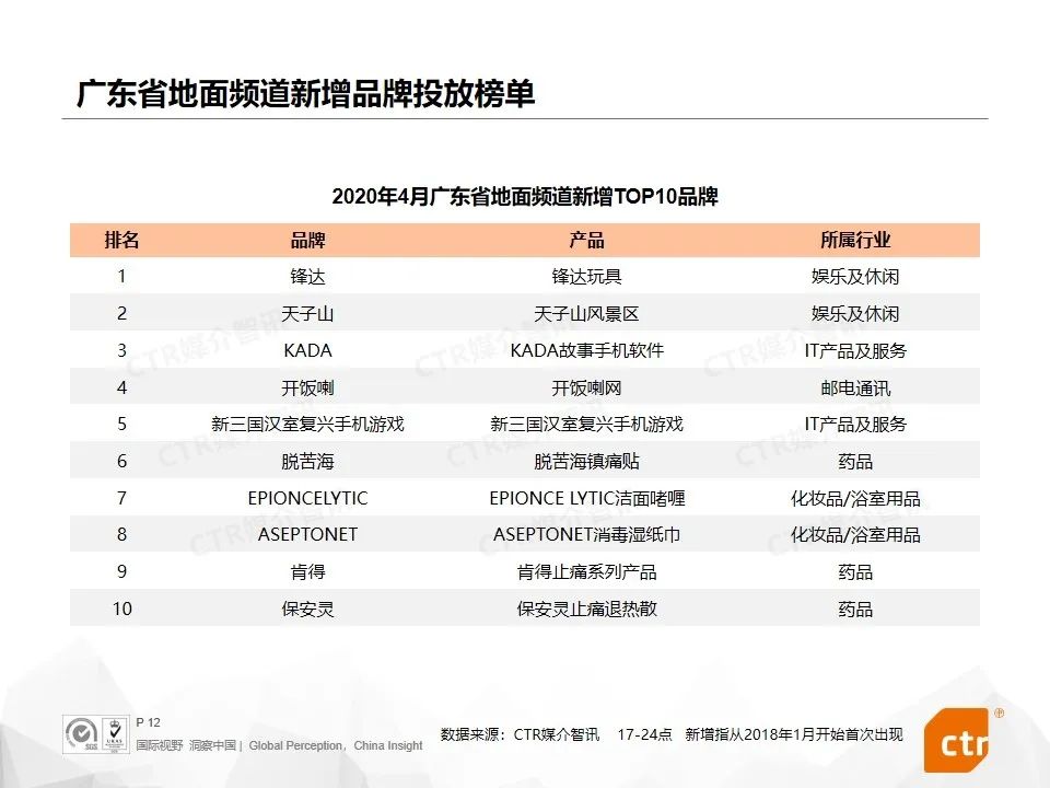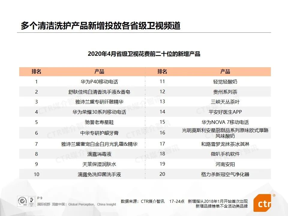 4月,新冠疫情影响犹在,新产品榜单中还有不少与清洁相关的产品投放。舒肤佳纯白清香洗手液&香皂、滴露消毒液、滴露免洗抑菌洗手液都首次在省级卫视投放广告。格力新品格力杀新冠空气净化器在广东卫视投放广告。