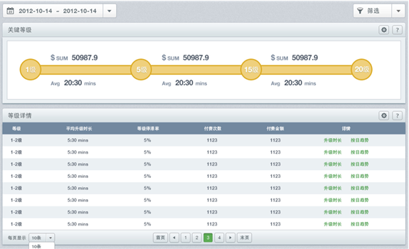 TalkingData Game Analytics 2.0增加了实时的在线用户查看功能,ACU和PCU一向是游戏火热度的关键指标,在2.0版中会更加直观的为您呈现这些数据。并且,在线用户功能中还将展示实时的用户在线情况,同时支持展开查阅近期一些玩家的详细游戏行为。TalkingData Game Analytics 2.0进一步对玩家分析模块进行体系化设计,从新增到留存再到付费转化、用户流失,新的玩家分析模块中提供了用户全生命期的关键指标查询。 等级是玩家游戏进度的直接体现,在TalkingData Game Analytics 2.0中除了帮助跟踪玩家等级的分布情况和变迁趋势外,还可以细化至每个等级中,详细解析每个等级的升级时长和等级滞留情况等等。与玩家等级相对的,任务和关卡是游戏中玩法的最直接体现,数据将帮助你有效的调整难度、策略,将对玩家留存起到最大的帮助;同时对活动副本的单独分析也是设计计费点的重要参考因素。