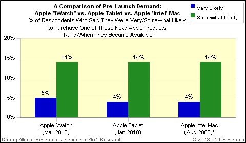 ChangeWave Research最新的一份研究数据显示5%的消费者非常有欲望为自己和他人购买苹果的智能手表,14%的人则表示愿意购买苹果智能手表。与此可进行比较的 是,2010年1月份18%的消费者说他们愿意购买苹果的平板,4%的人则非常想购买。再将时间推前到2005年,当时的统计数据显示18%的人对购买采 用Intel处理器的Mac设备感兴趣。