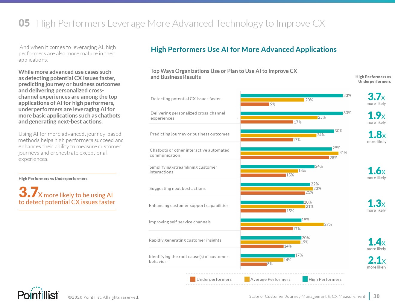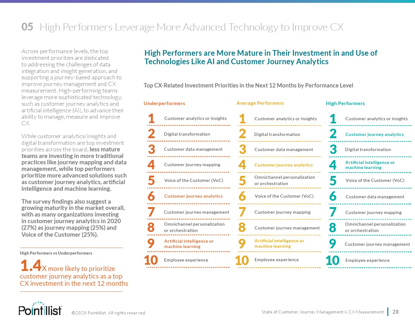表现优秀的受访者(92%)比表现不佳的受访者(64%)更有可能表示,基于历程的战略对其企业的整体成功非常或极其重要。表现优秀的CX专业人员(70%)拥有专门的客户历程管理角色或团队的可能性也是表现不佳的(31%)的两倍多。