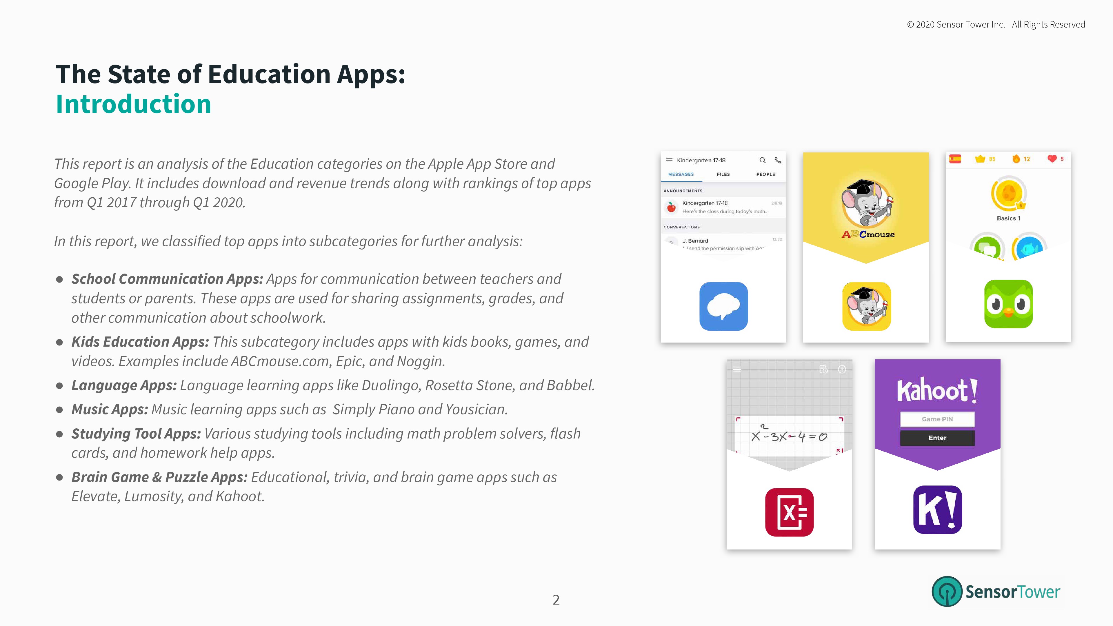 Sensor Tower将热门应用程序分成了几个子类别以方便进一步分析:学校通信应用程序、儿童教育应用程序、语言应用程序、音乐应用程序、学习工具应用程序、大脑游戏应用程序和益智应用程序。