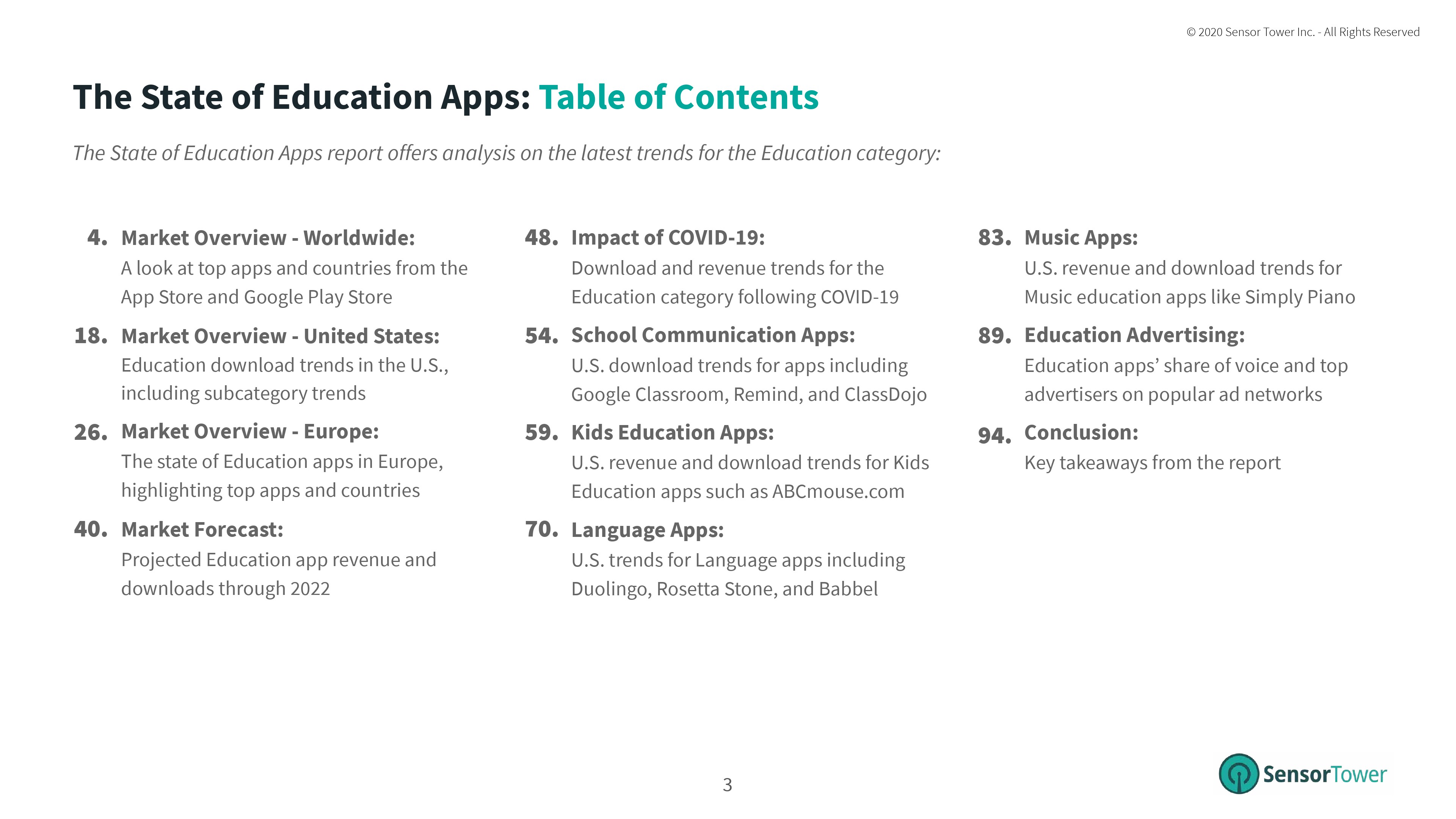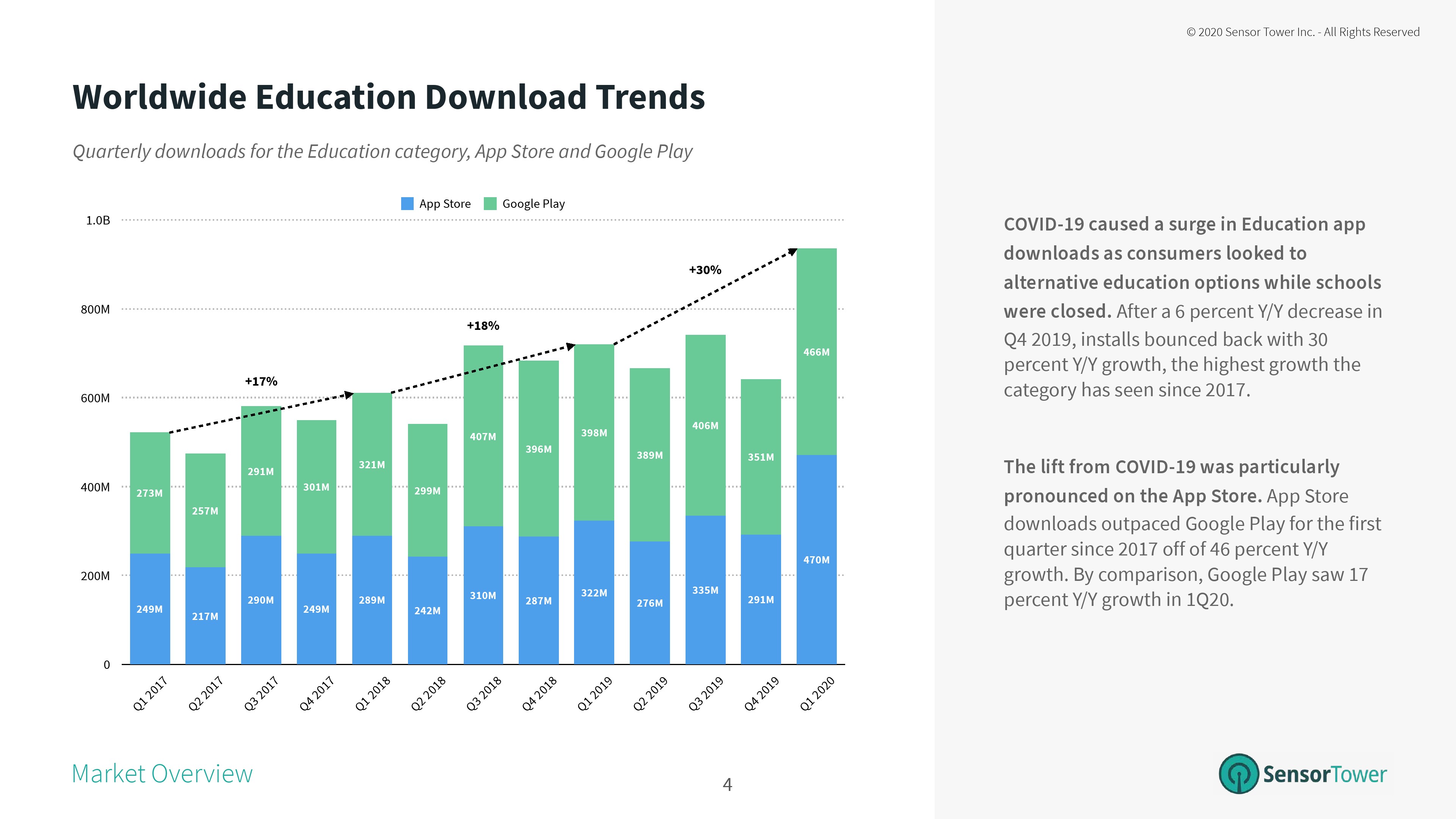 COVID-19导致教育应用程序下载量激增,因为消费者在学校停课时寻求替代教育选择。在2019年第四季度同比下降6%之后,下载量出现反弹,同比增长30%,这是自2017年以来该类别增长率最高的。