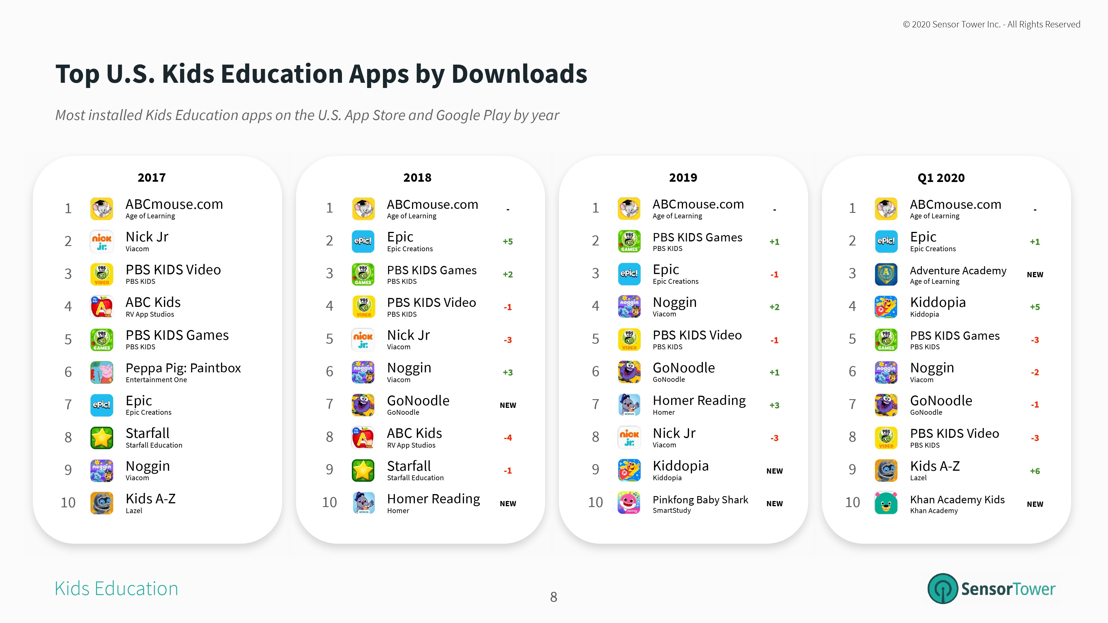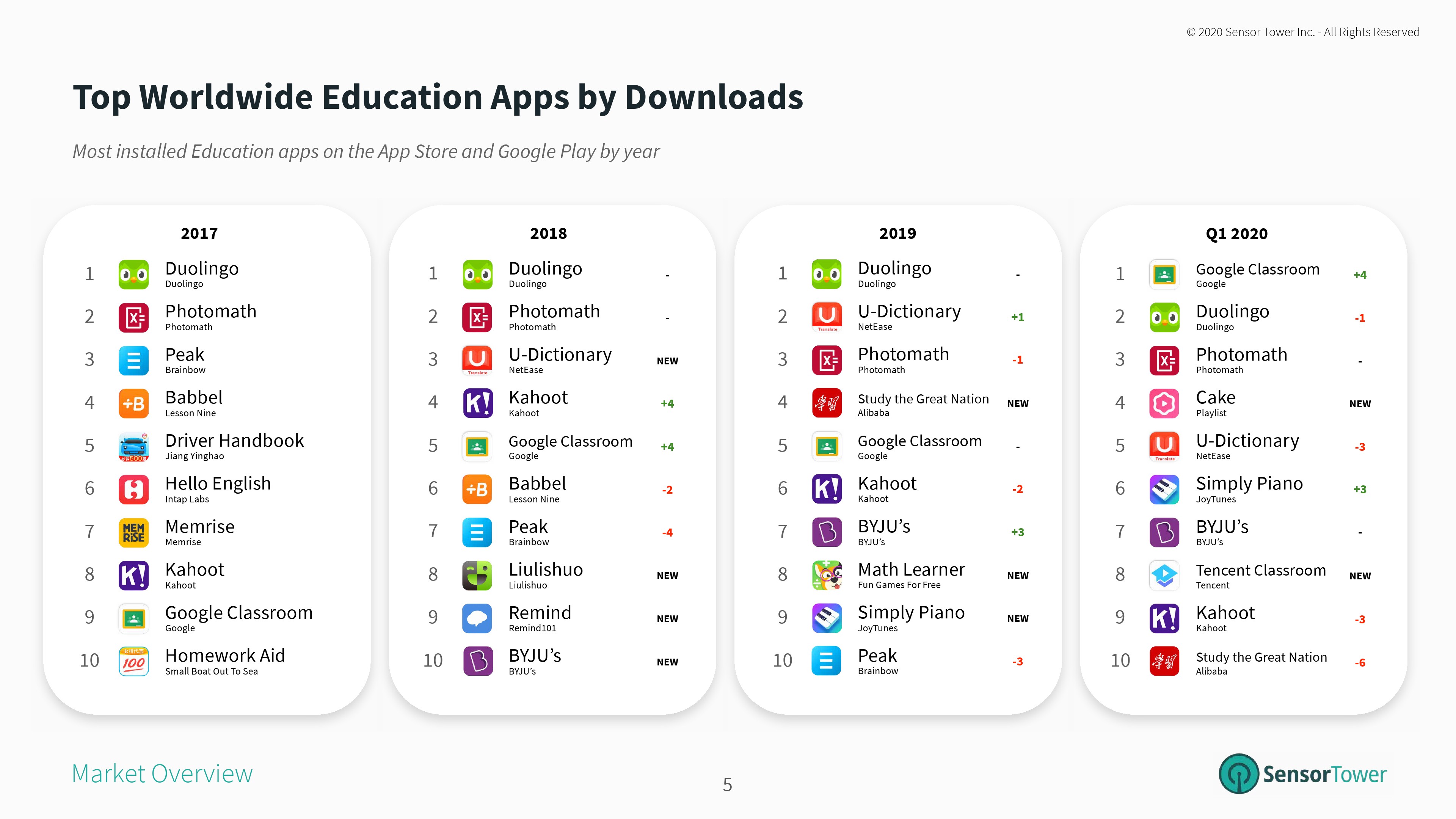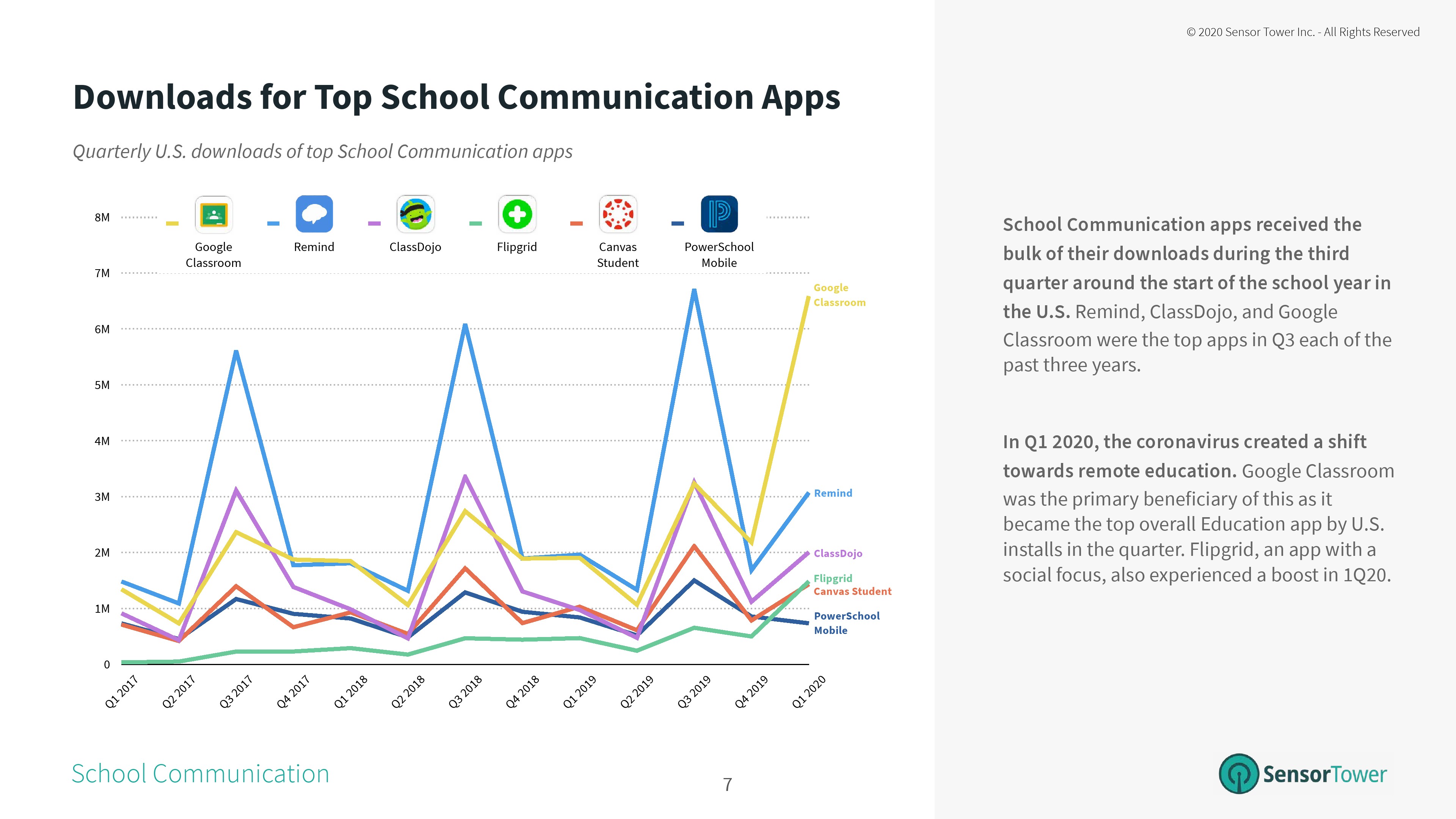 在2020年第一季度,COVID-19引发了向远程教育的转变。谷歌课堂是这一点的主要受益者,因为它成为本季度美国下载量最高的教育应用程序。Flipgrid是一款专注于社交的应用程序,在2010年第一季度也经历了提振。