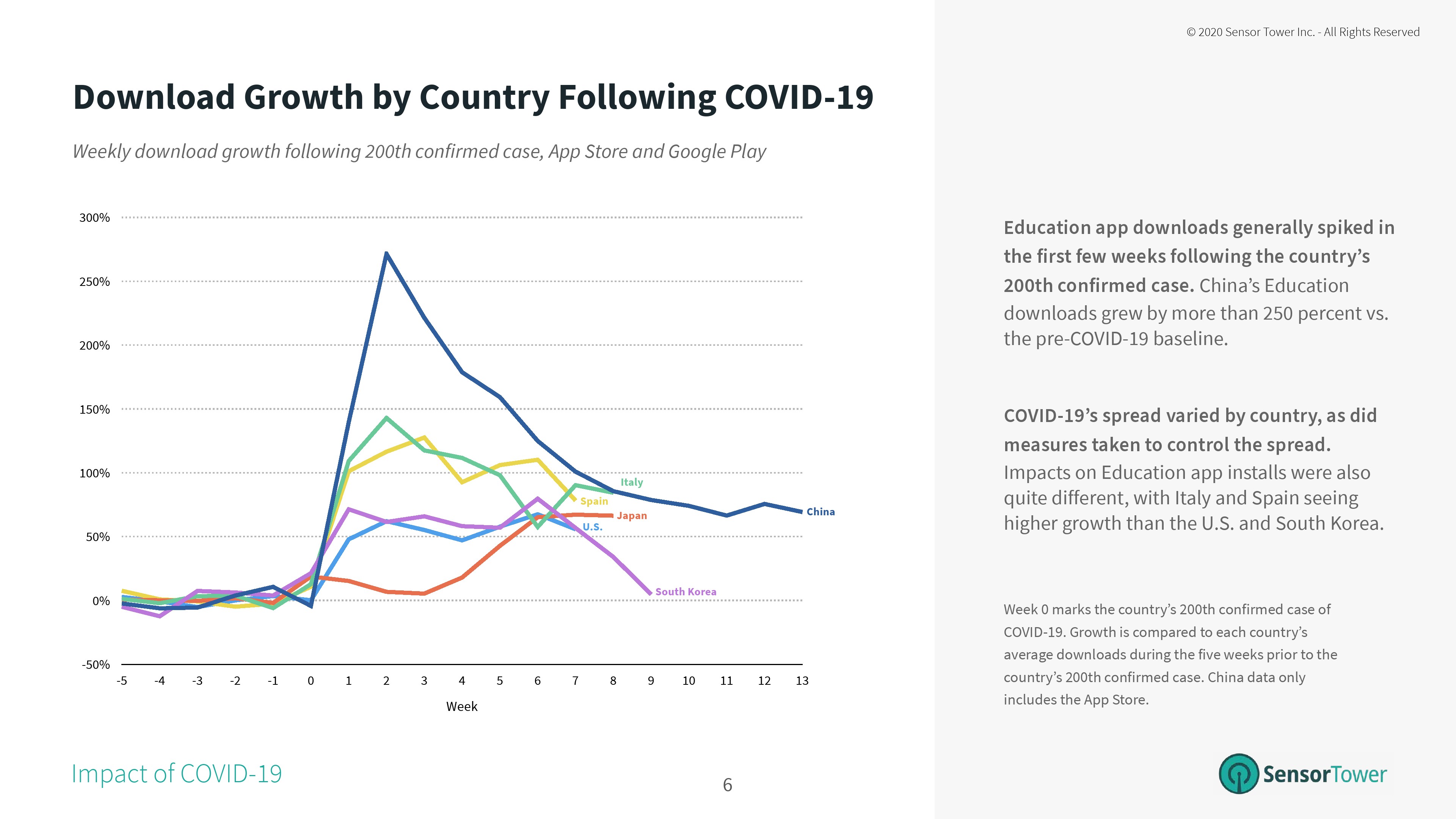 在中国出现确诊病例的头几周,教育应用程序的下载量普遍上升。与COVID-19之前的基线相比,中国的教育应用下载量增长了250%以上。