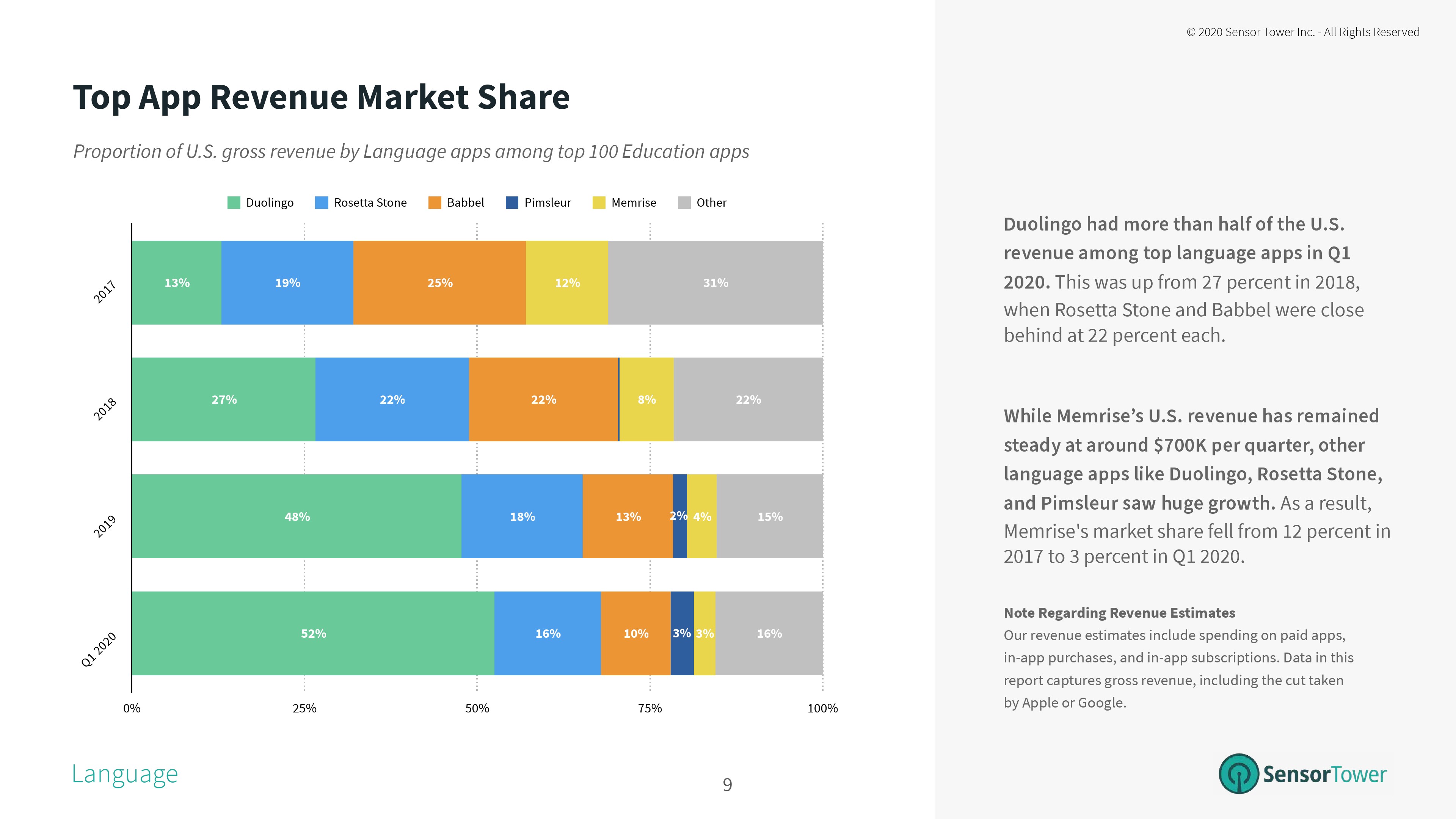 虽然Memrose在美国的收入稳定在每季度70万美元左右,但其他语言应用程序如Duolingo、Rosetta Stone和Pimsleur却出现了巨大的增长。因此,Memrose的市场份额从2017年的12%下降到2020年第一季度的3%。