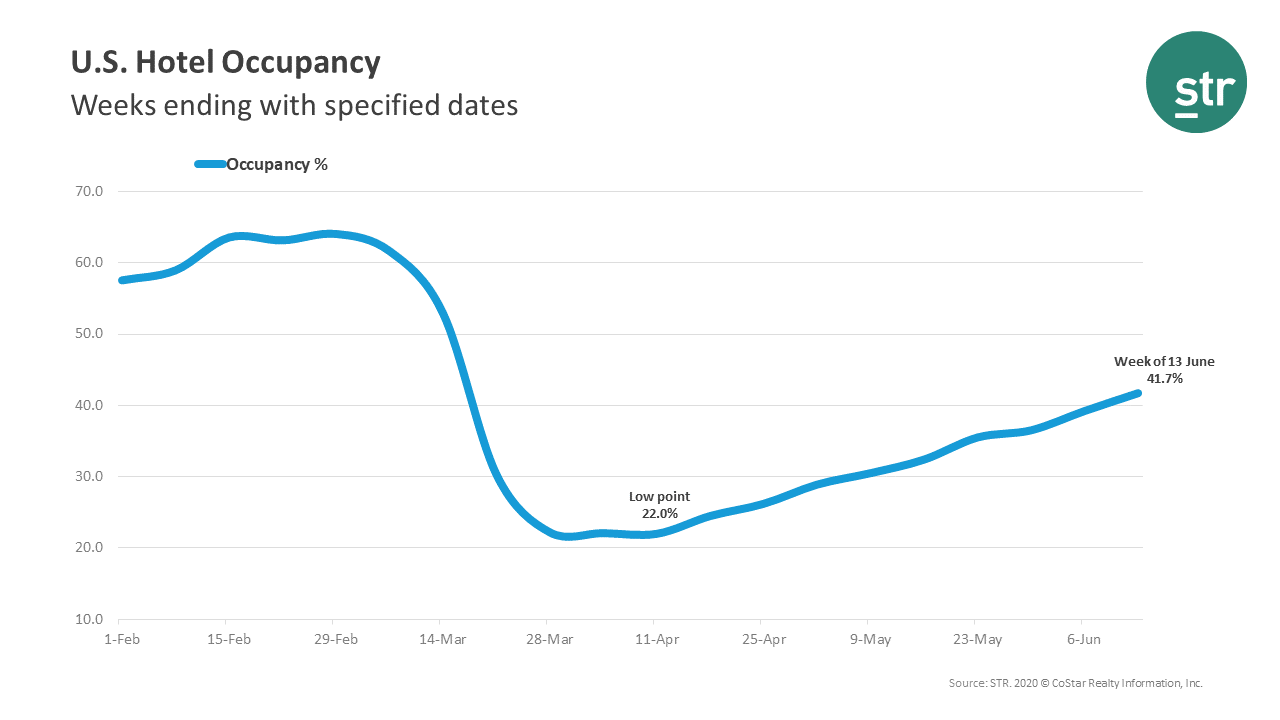 不过,截至6月13日的一周,高速公路地点或小城镇和郊区地点的酒店入住率已恢复至44%至46%,随着航空公司开始更定期地飞行,机场酒店入住率达到39%。