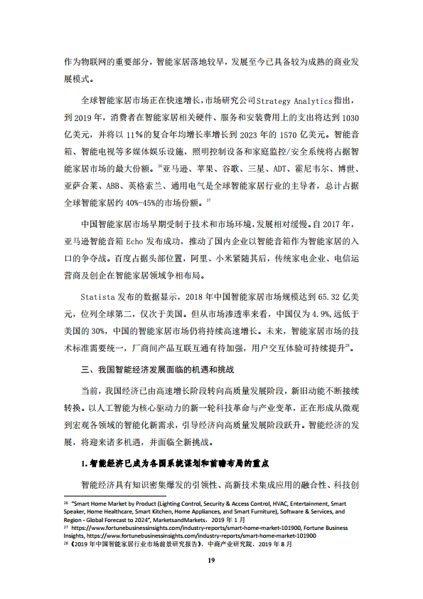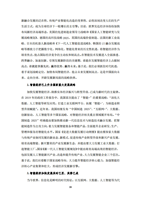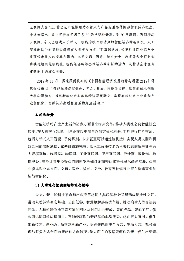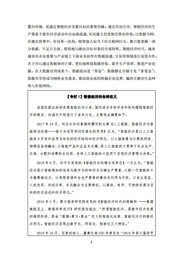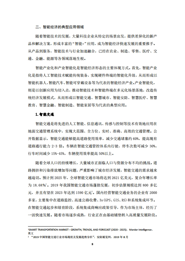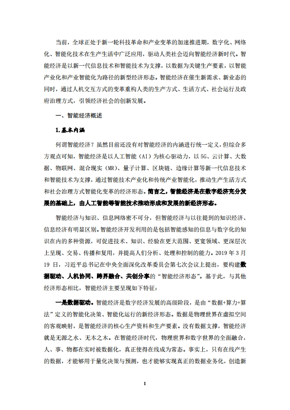 白皮书指出,智能经济是在数字经济充分发展的基础上,由人工智能(AI)等新一代智能技术推动形成和发展的新经济形态。通过智能技术产业化和传统产业智能化,智能经济促进人类生产生活方式、社会治理与服务方式全面向智能化方向转变,形成以智能交通、智慧城市、智慧医疗、智慧教育、智慧金融、智能制造、智能家居等为代表的典型应用场景。