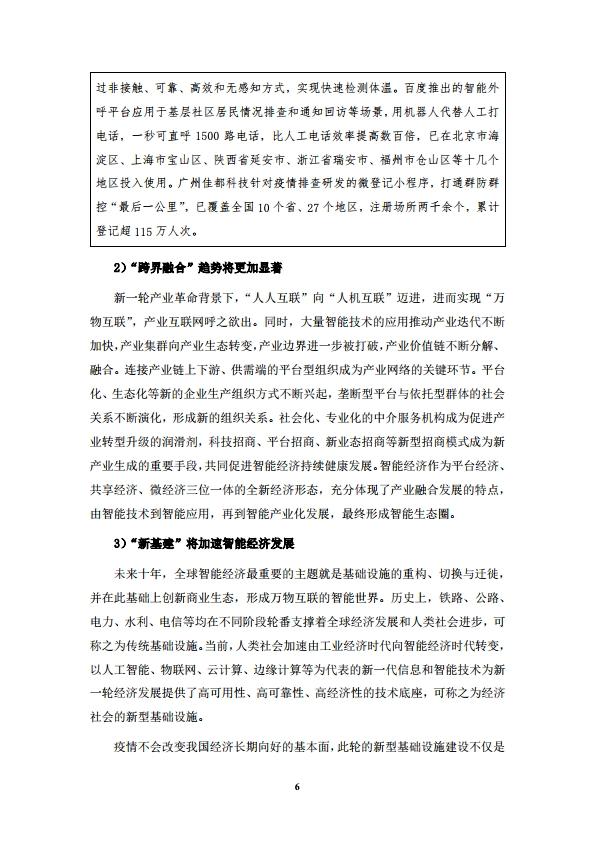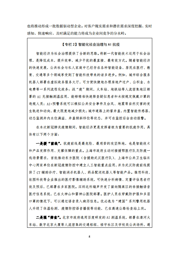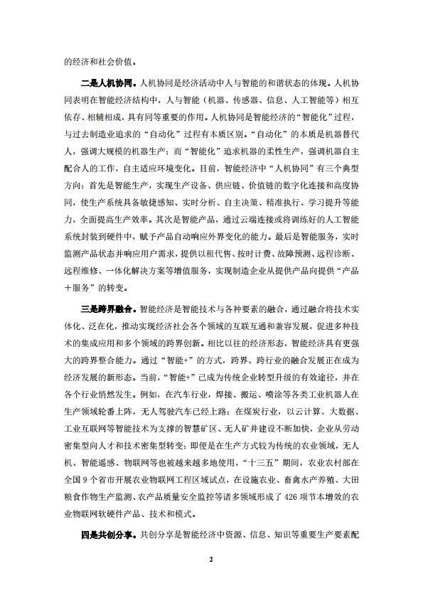 此次新冠肺炎疫情暴发以来,智能经济从援“前线”和强“筛查”等不同方向支持医院与社区的疫情防控工作,在提高国家公共卫生应急管理水平中发挥了重要的作用。与其他经济形态相比,智能经济具有数据驱动、人机协同、跨界融合、共创分享的特点,将在更大范围内催生新技术、新业态、新模式和新产业。