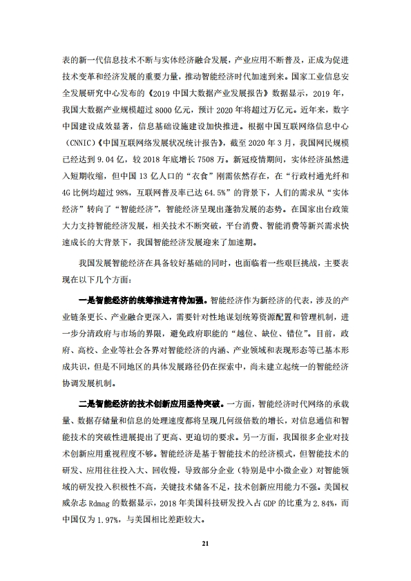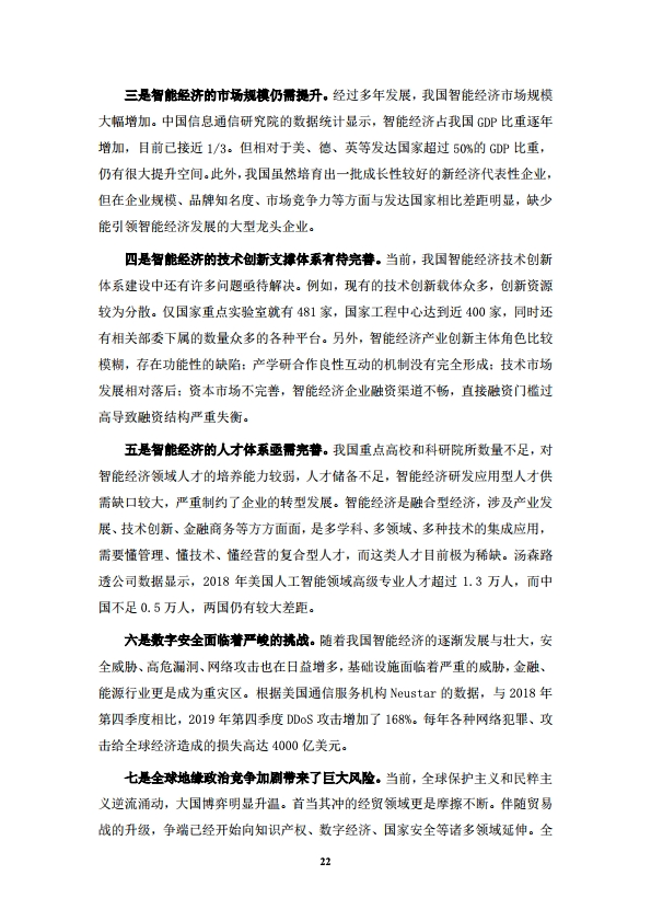 白皮书指出,现阶段我国智能经济发展机遇与挑战并存。一方面,在国家出台政策大力支持智能经济发展,相关技术不断突破,平台消费、智能消费等新兴需求快速成长的大背景下,智能经济加快发展其时已至、其势已成;另一方面,我国发展智能经济也面临着关键技术储备不足,技术创新应用能力不强,创新支撑体系和人才体系不够完善,数字安全风险上升,科技竞争加剧等严峻挑战。智能经济发展不仅涉及多行业、多领域的技术和产业变革,还将对就业、安全等社会各个方面产生深层次影响。我们必须在这场深度变革中抓住机遇,着手谋划战略定位,加快布局智能经济,抢占未来发展制高点,这是中国面向未来、走向全球,开辟发展新局面的战略抉择。