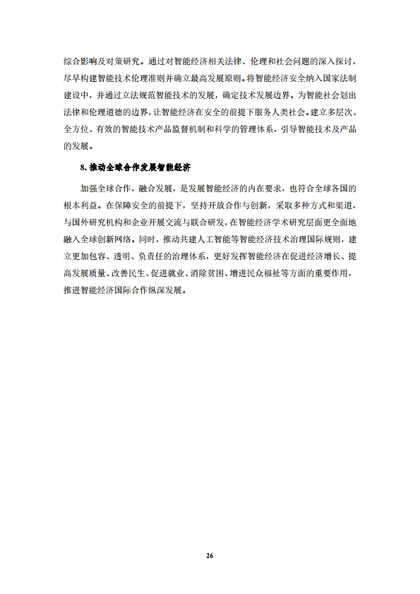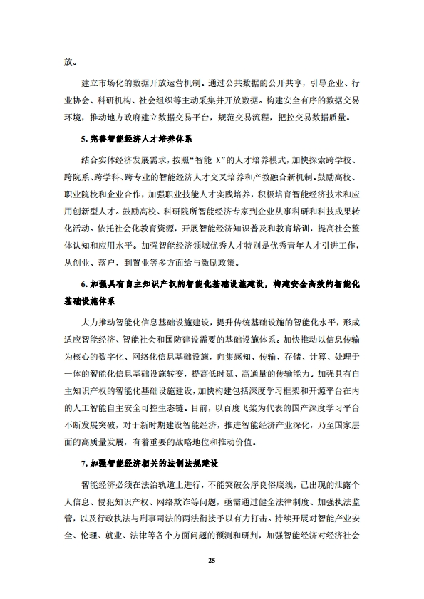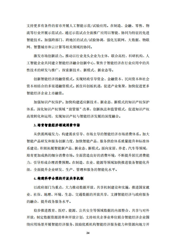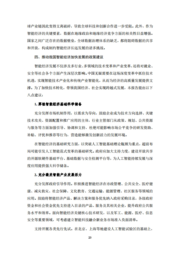 积极推进智能经济在市政管理、公共安全、医疗健康、减灾救灾、社会保障、文化教育、交通运输、能源管理、社区服务等领域的应用,通过创新投融资模式、加强知识产权保护、促进科技成果转化等手段充分激发智能产业发展活力;支持企业成为技术方向选择、关键技术攻关和推广应用的主体,适当超前布局可能引发人工智能范式变革的基础研究;构建需求引导、市场主导的智能经济市场消费体系;以政府部门为重点,大力推动数据开放、共享机制建设和实施;将智能经济安全纳入国家法制建设中,并通过立法规范智能技术的发展,确定技术发展边界;建立更加完善的人工智能伦理规范,让技术创新更好地造福人类;在保障安全的前提下,坚持开放合作与创新,推动共建智能经济技术治理国际规则,建立更加包容、透明、负责任的治理体系。