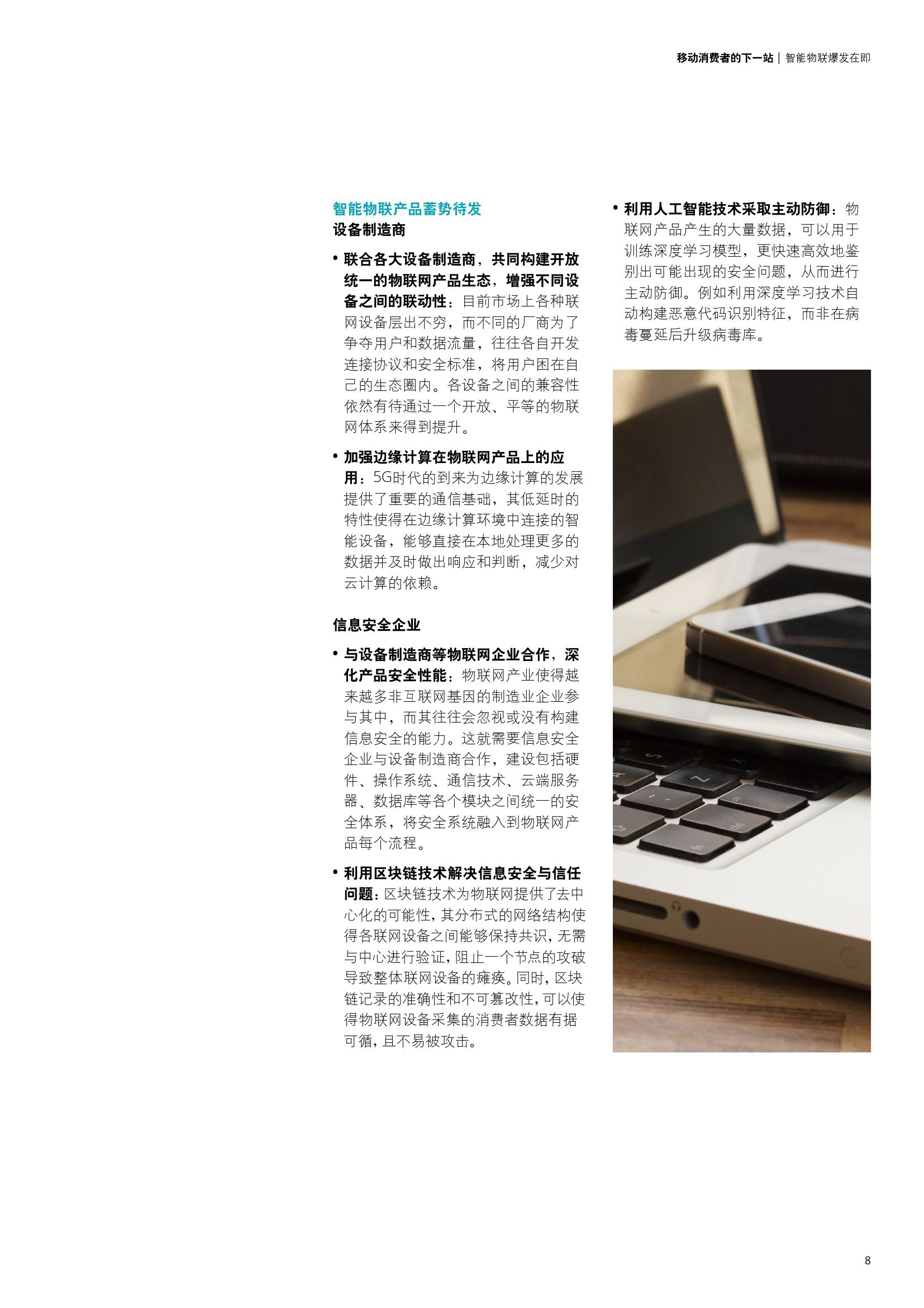- 面对快速增长的物联网市场,各大智能物联设备制造商需强强联合,共同构建开放统一的物联网产品生态,增强不同设备之间的联动性;同时应重视并加强区块链、人工智能等技术在信息安全领域的应用,深化物联产品安全性能。