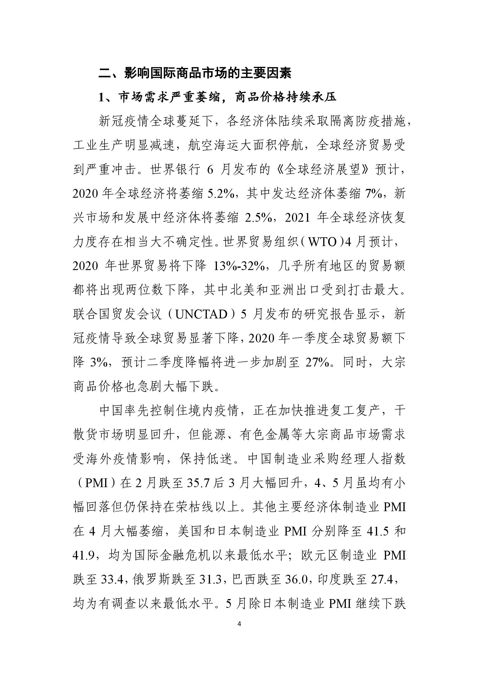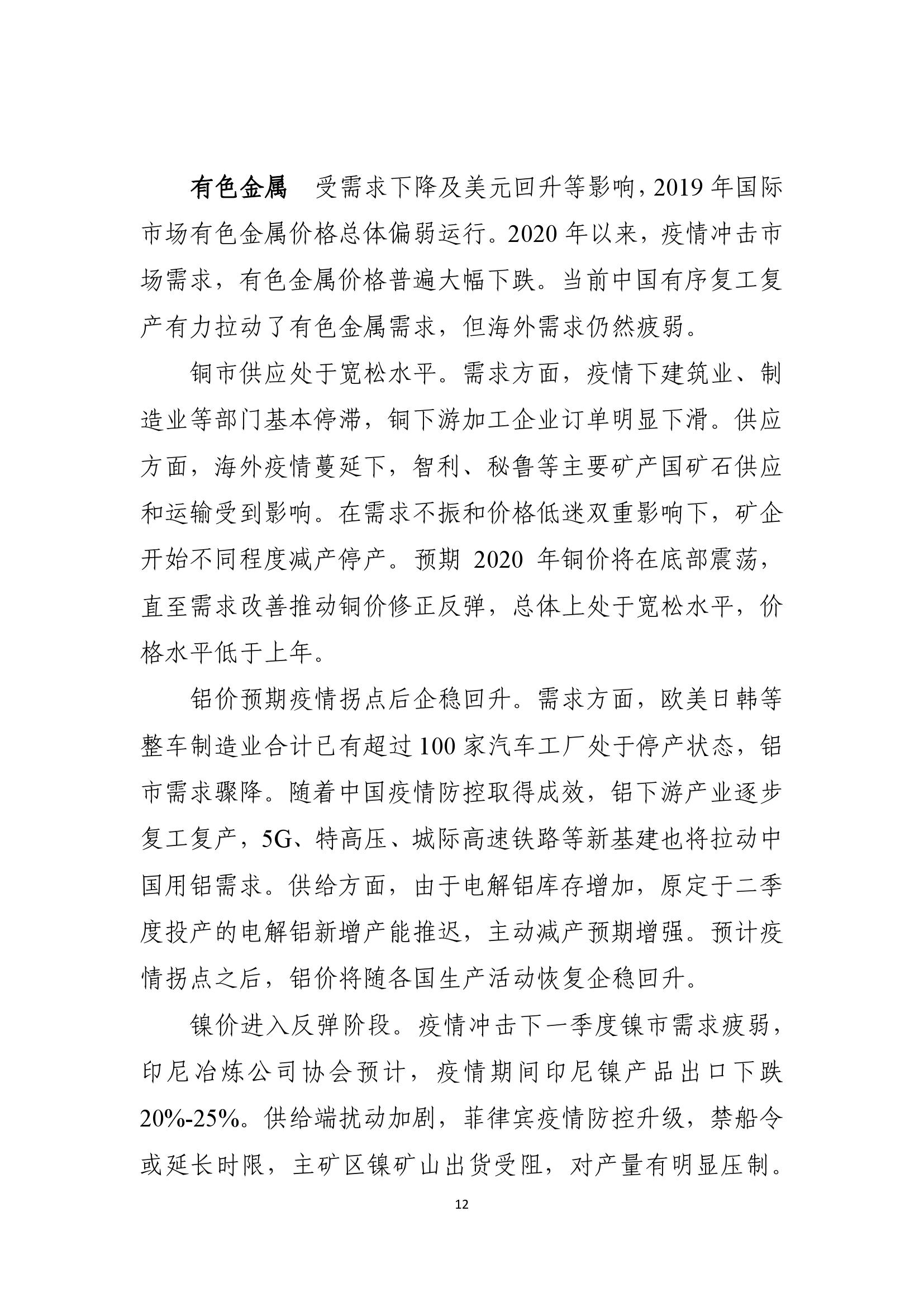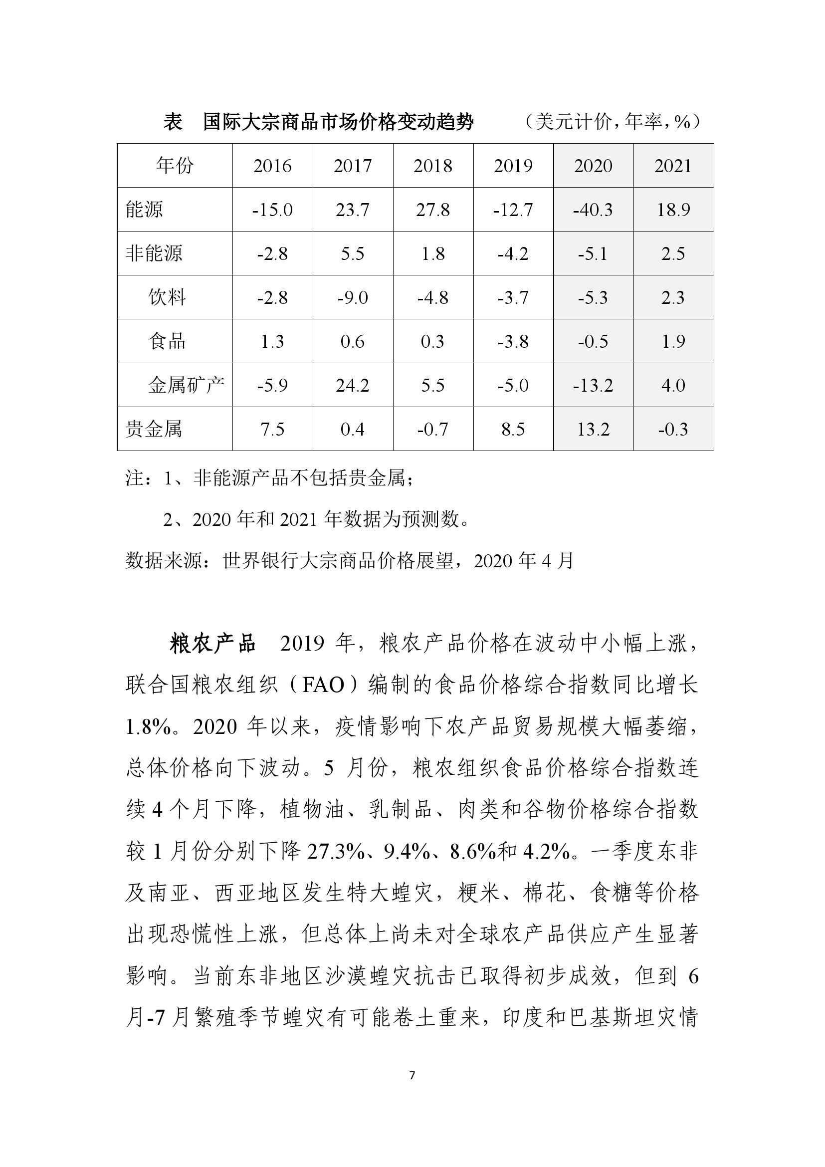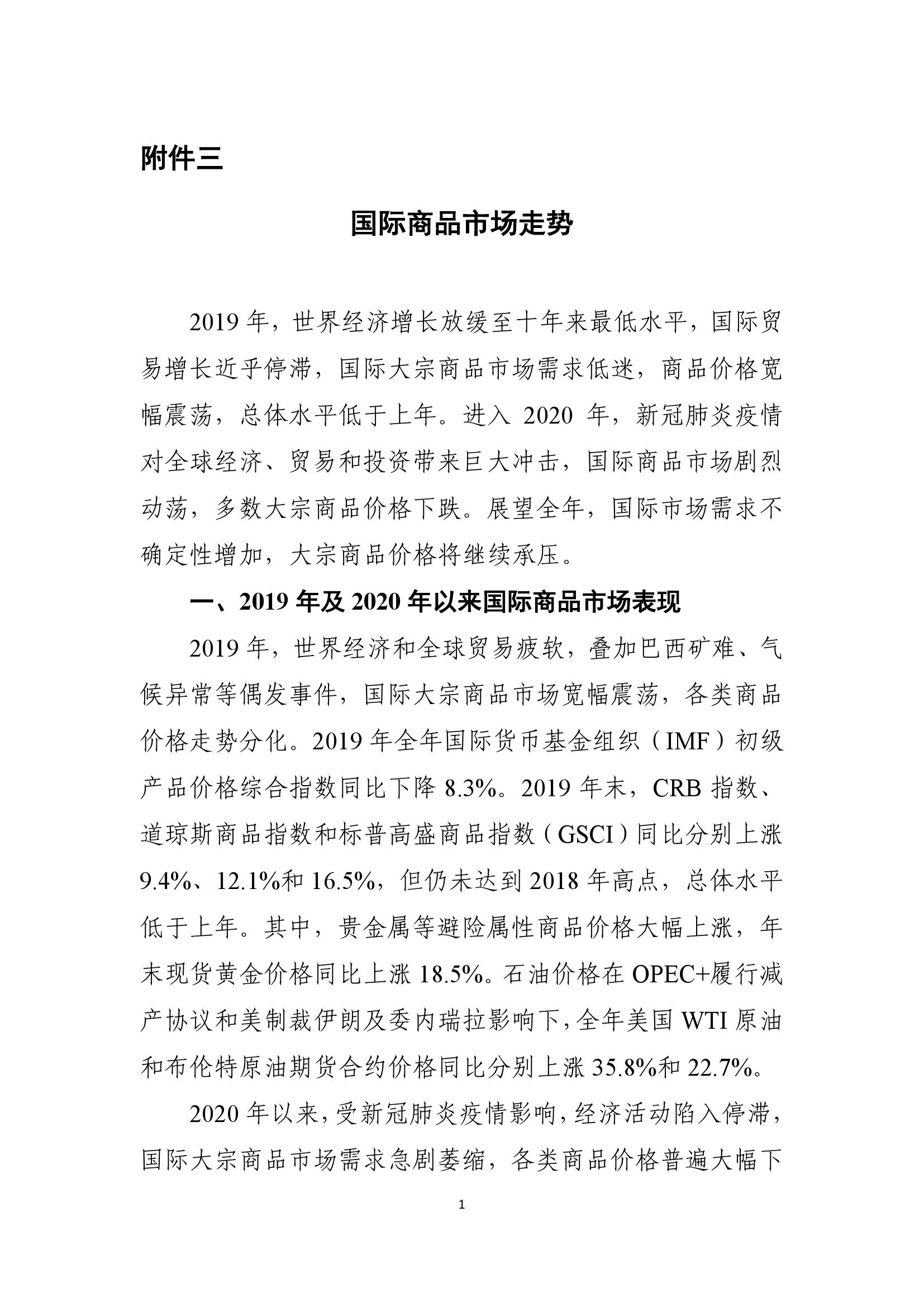2019 年世界经济增长放缓至十年来最低水平,国际贸易增长近乎停滞,国际大宗商品市场需求低迷,商品价格宽幅震荡,总体水平低于上年。进入 2020 年,新冠肺炎疫情对全球经济、贸易和投资带来巨大冲击,国际商品市场剧烈动荡,多数大宗商品价格下跌。展望全年,国际市场需求不确定性增加,大宗商品价格将继续承压。