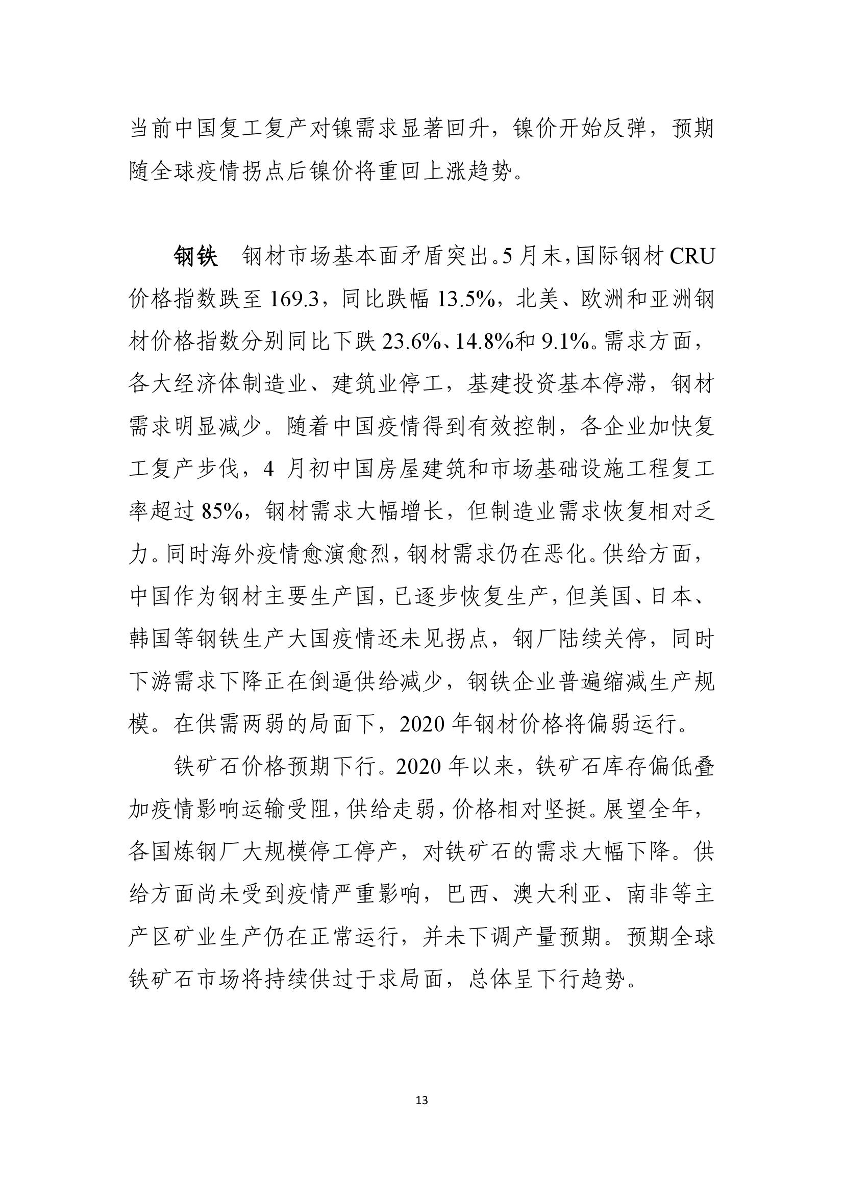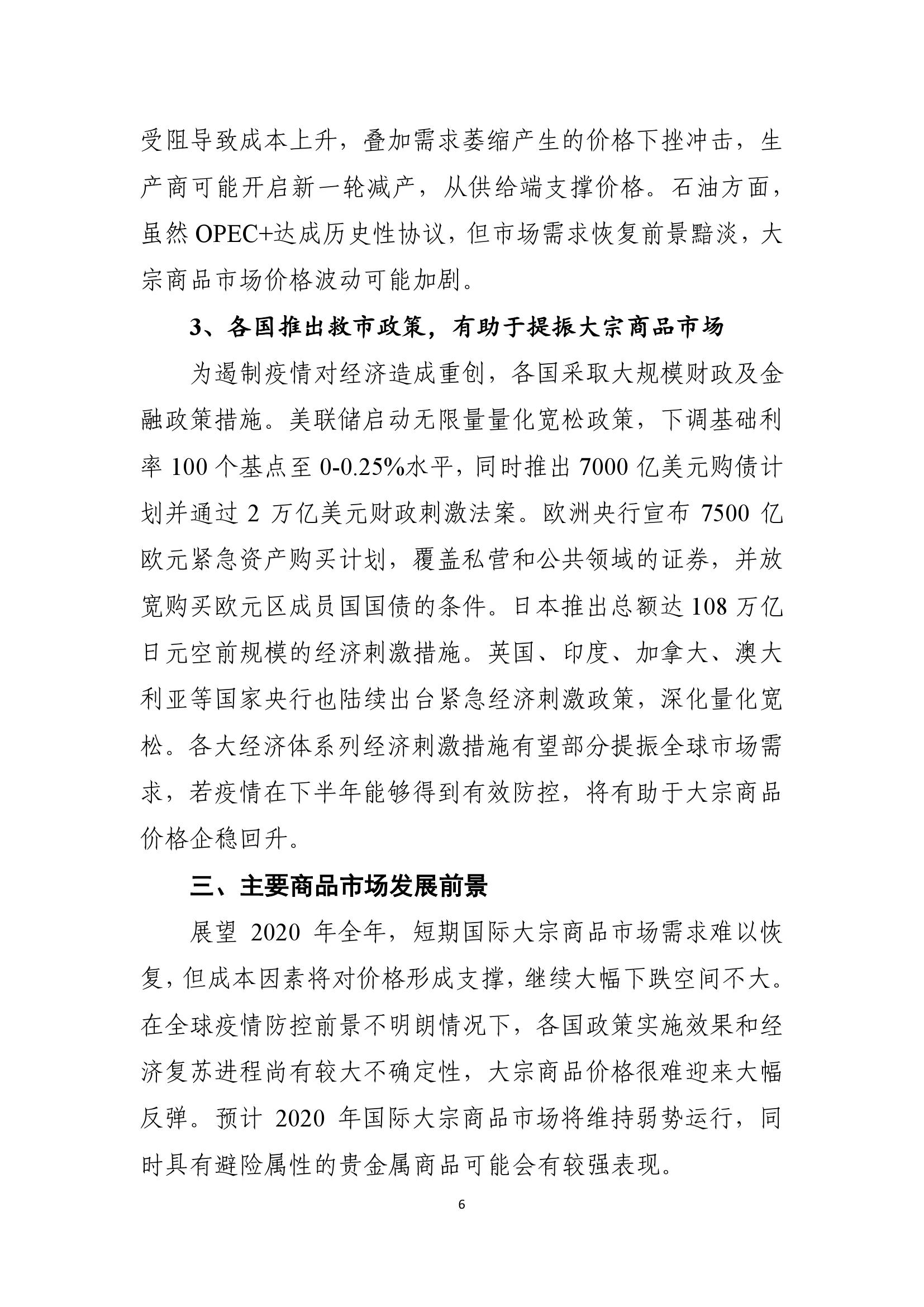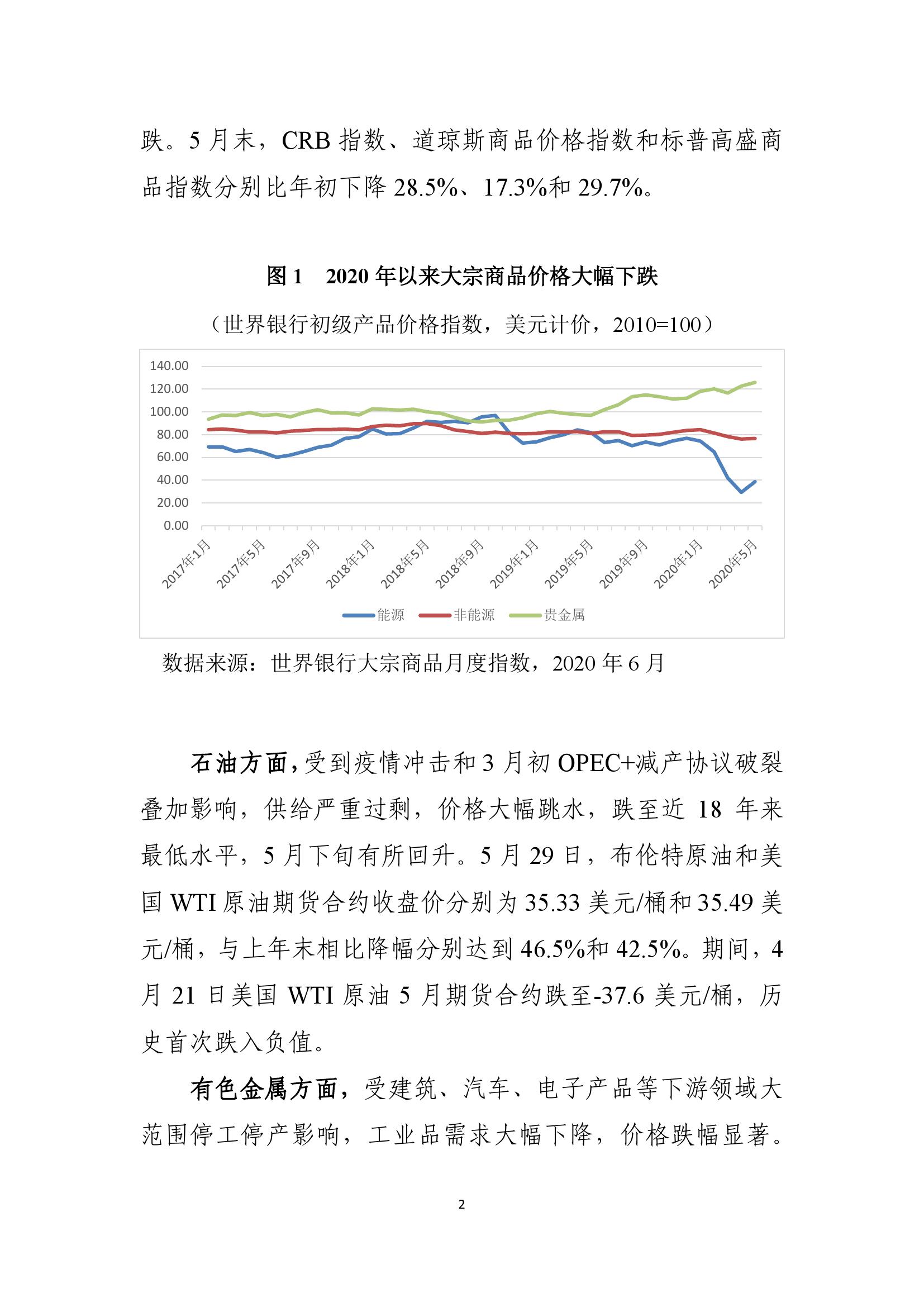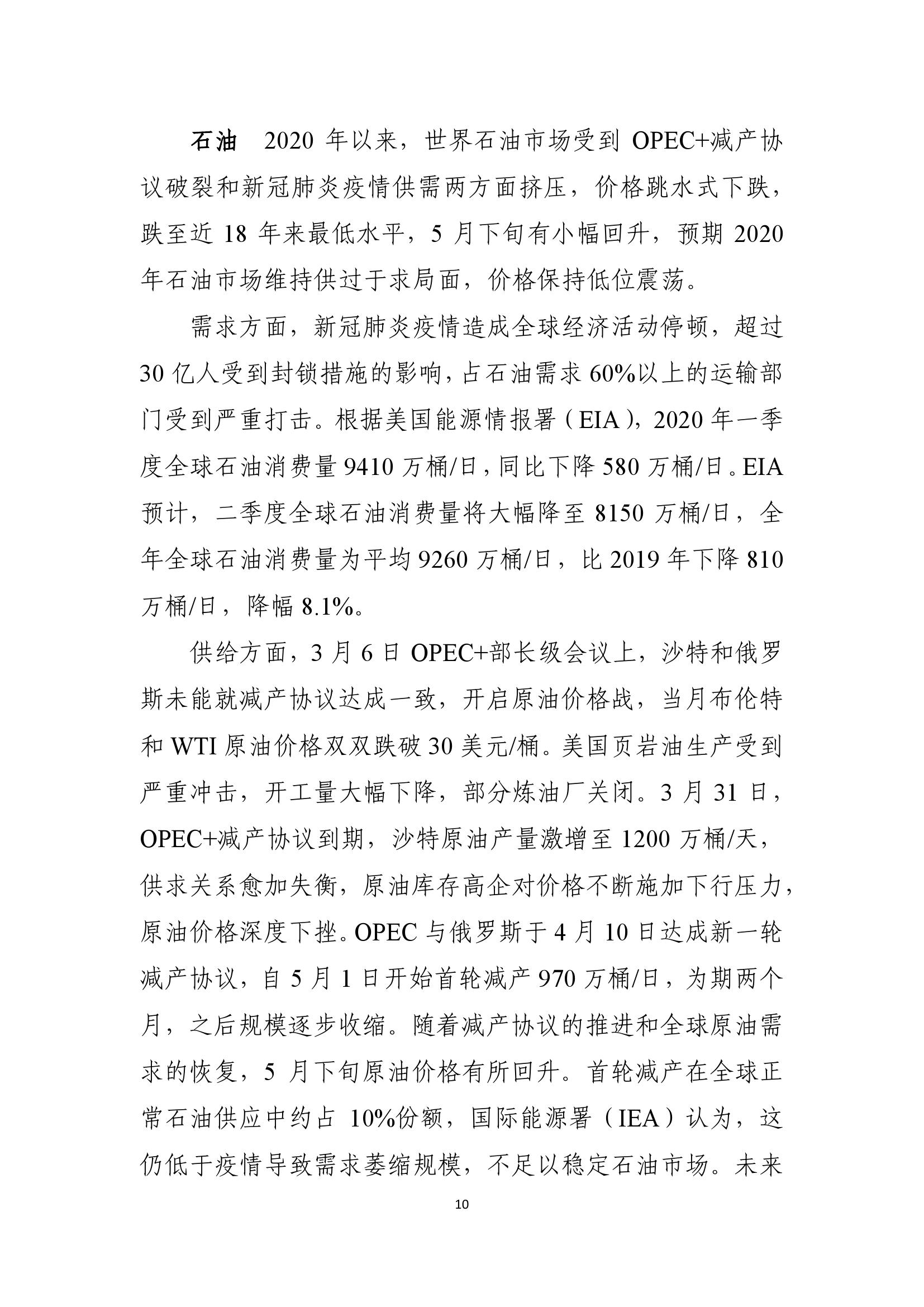 2019 年世界经济增长放缓至十年来最低水平,国际贸易增长近乎停滞,国际大宗商品市场需求低迷,商品价格宽幅震荡,总体水平低于上年。进入 2020 年,新冠肺炎疫情对全球经济、贸易和投资带来巨大冲击,国际商品市场剧烈动荡,多数大宗商品价格下跌。展望全年,国际市场需求不确定性增加,大宗商品价格将继续承压。