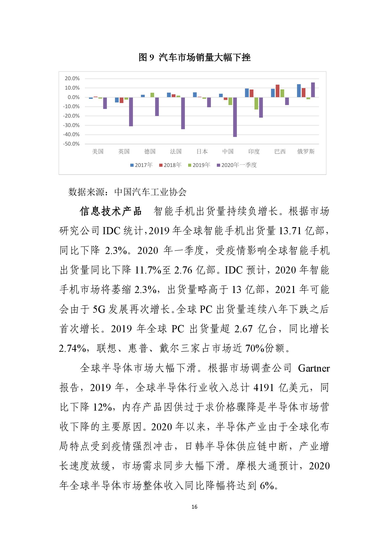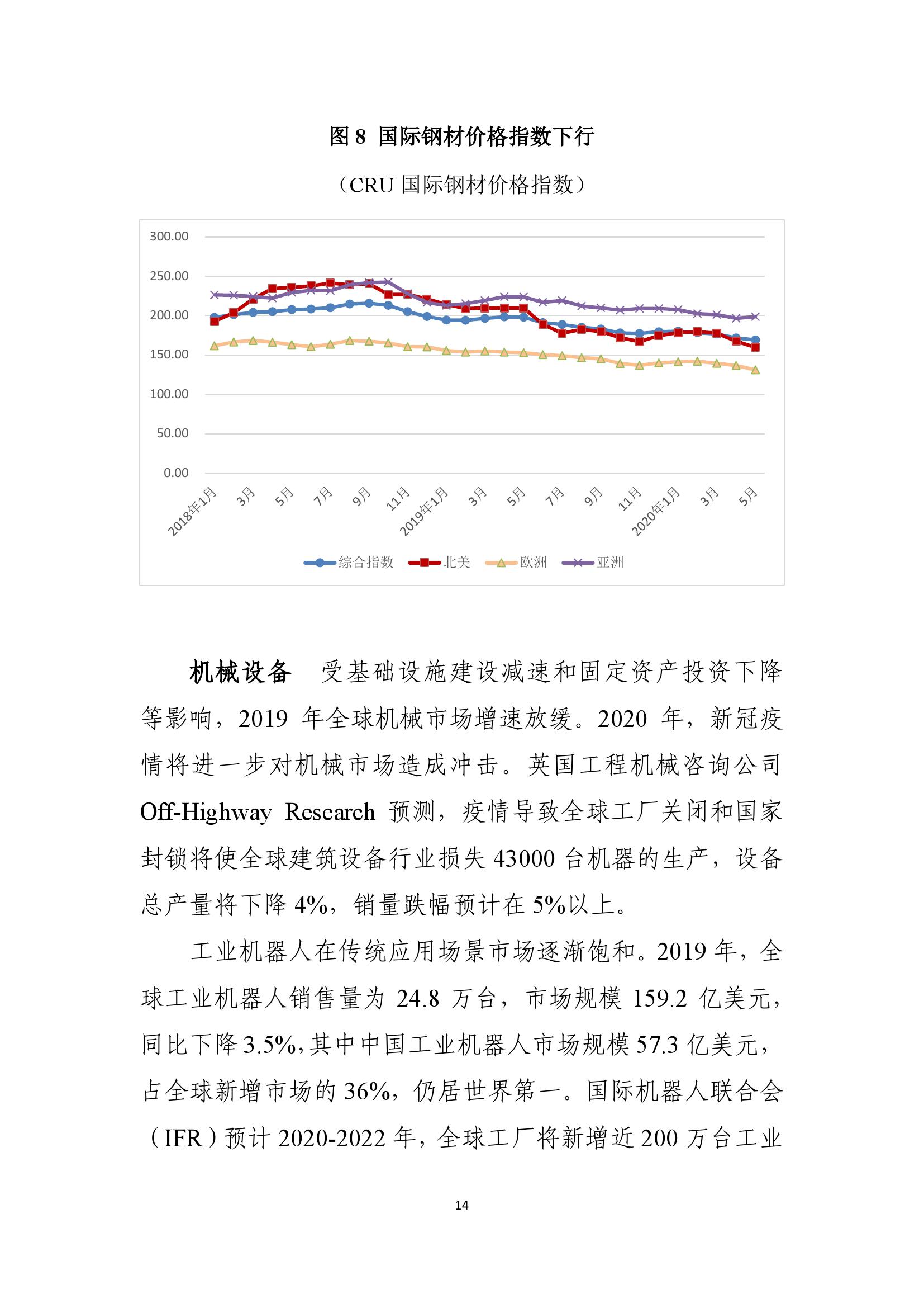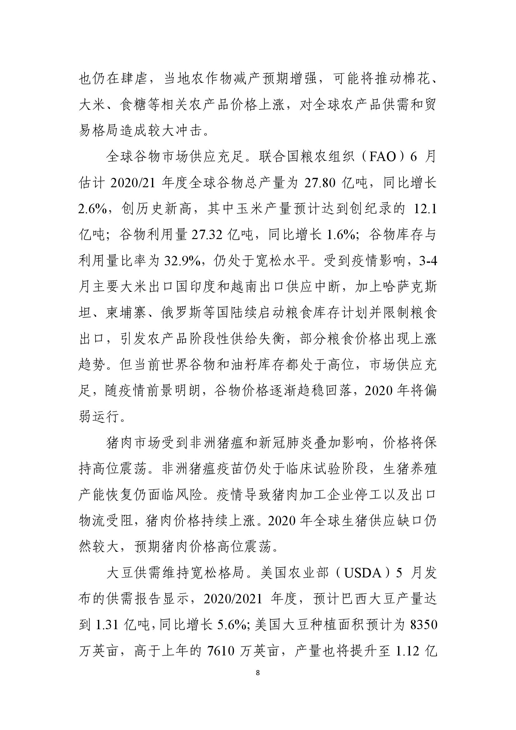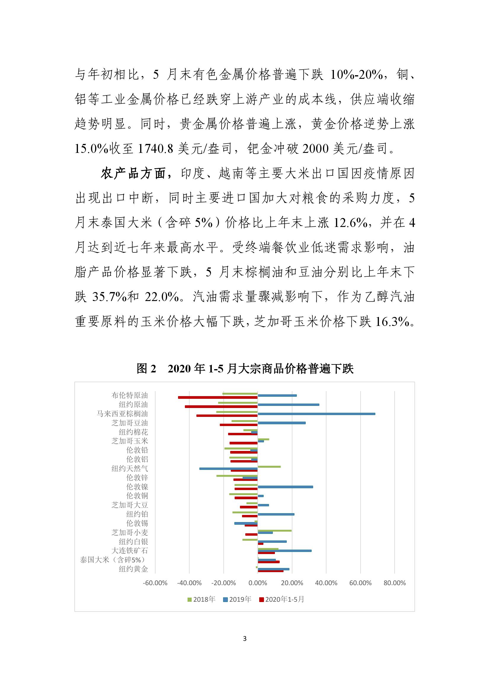 2019 年世界经济增长放缓至十年来最低水平,国际贸易增长近乎停滞,国际大宗商品市场需求低迷,商品价格宽幅震荡,总体水平低于上年。进入 2020 年,新冠肺炎疫情对全球经济、贸易和投资带来巨大冲击,国际商品市场剧烈动荡,多数大宗商品价格下跌。展望全年,国际市场需求不确定性增加,大宗商品价格将继续承压。