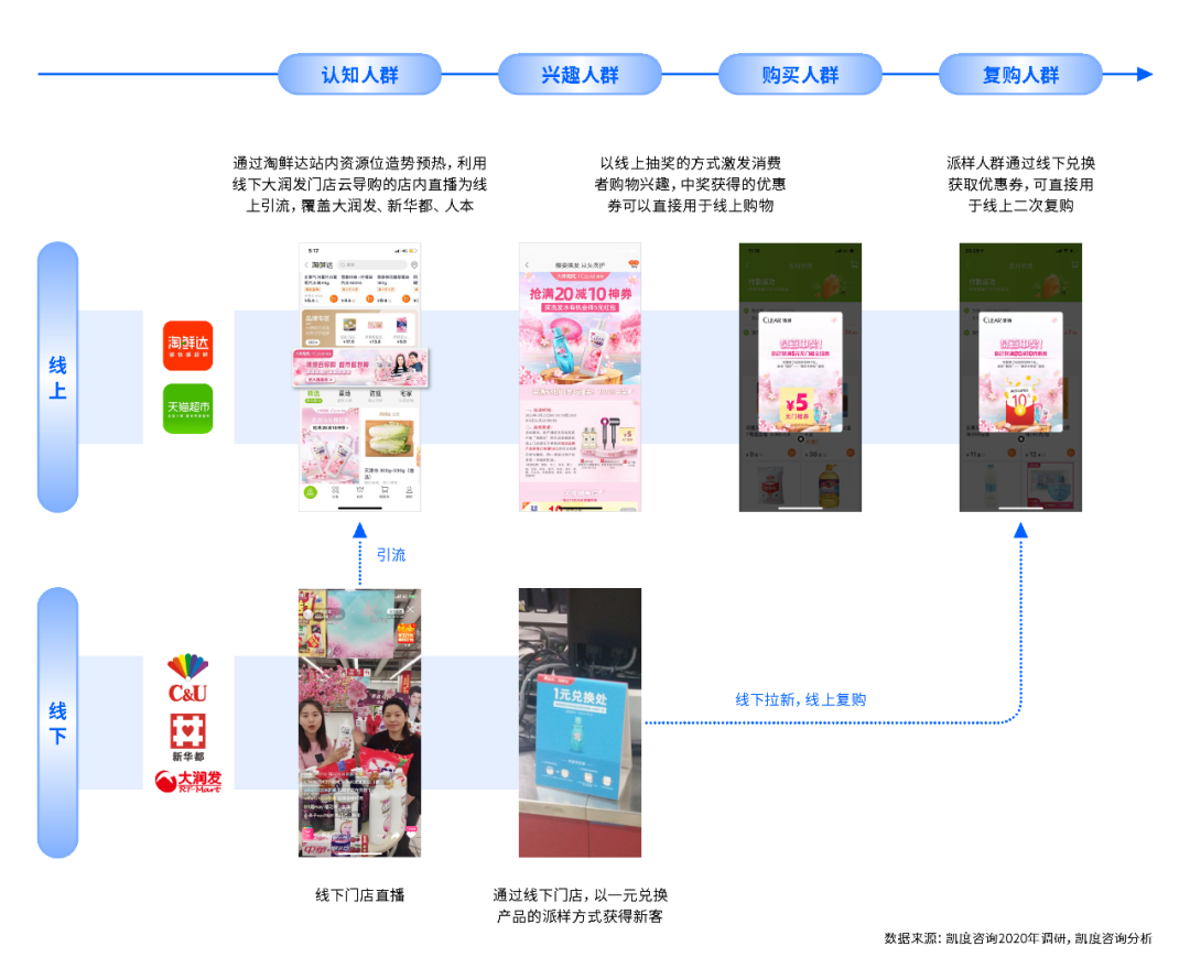 同时,包括大润发,新华都,人本等线下商超在内的云导购不断进行店内直播造势,为线上引流,转化淘鲜达配送范围内的潜在消费者。最终,通过线下一元小样派发及新客优惠券,打通派样人群线上复购链路。