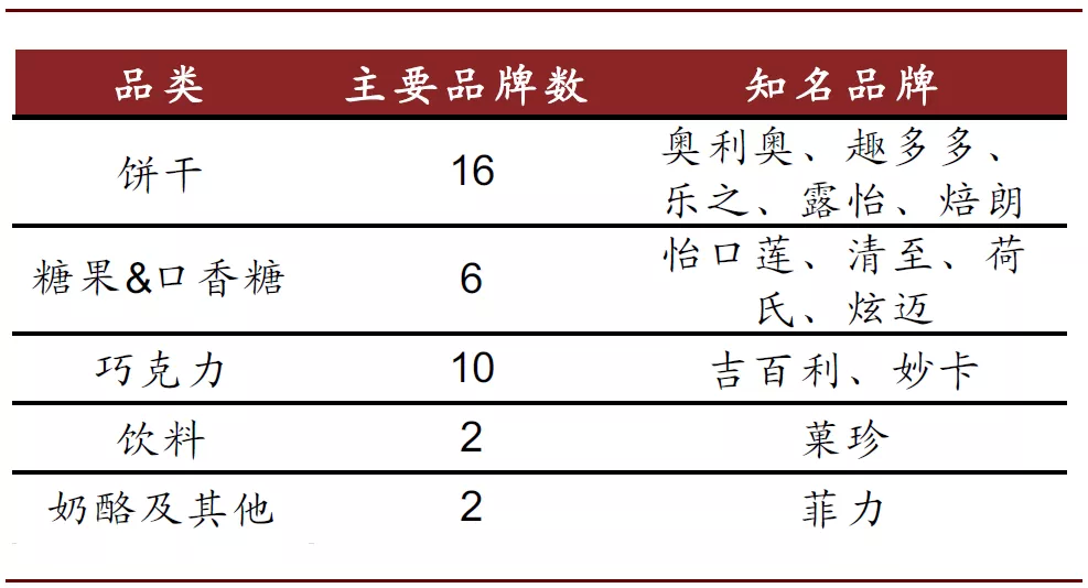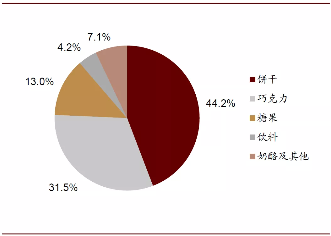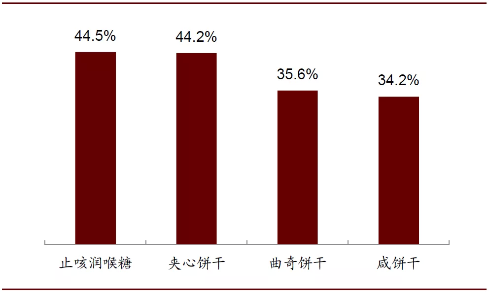 子品类结构丰富,持续渗透细分市场。公司通过丰富的子品类构成切入细分市场,以实现对不同消费人群和消费场景的覆盖,例如公司饼干品类包括夹心饼干、牛奶饼干、苏打饼干、五谷早餐饼干等,糖果品类包括太妃糖、口香糖、薄荷糖等。以零食市场发展较为成熟的美国为例,公司在止咳润喉糖、夹心饼干、曲奇饼干、咸饼干等细分品类中均占有1/3以上的市场份额,在优势细分领域中占据绝对领先地位。