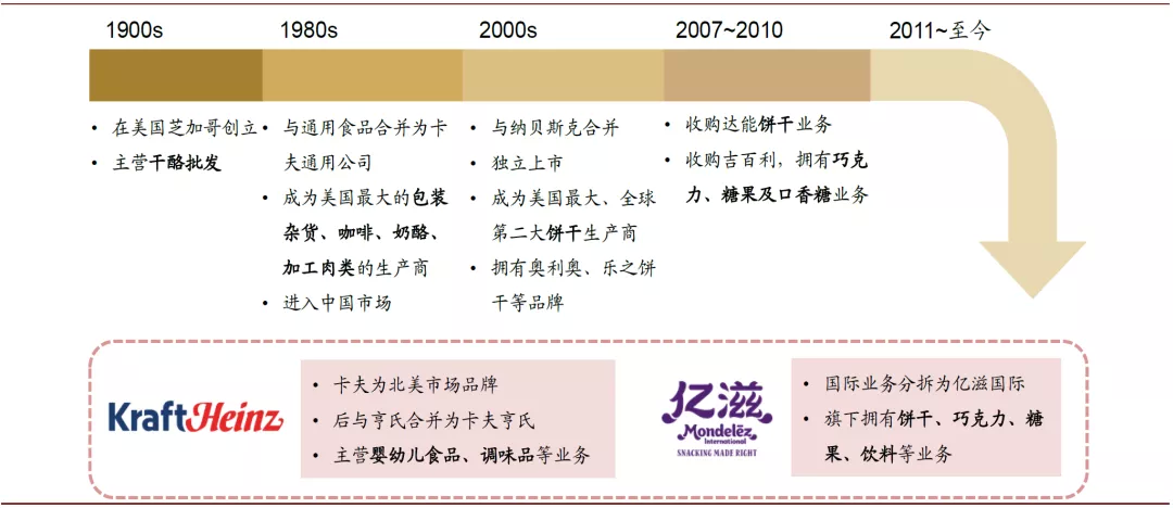 亿滋国际源于卡夫食品,卡夫食品成立于1903年,并于1988年被菲利浦莫里斯公司收购,并在此后的20年间通过并购持续扩大品类范围,并在饼干、糖果等领域取得行业领先地位。2012年卡夫食品拆分为两家独立上市公司,面向北美的杂货业务沿用卡夫的名字并于2015年与亨氏合并为卡夫亨氏,面向国际的零食业务成为亿滋国际。