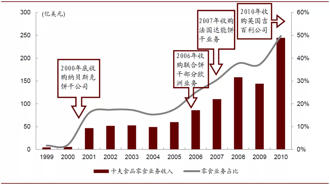 图表: 卡夫食品1999-2010年零食业务收入情况及主要并购事件