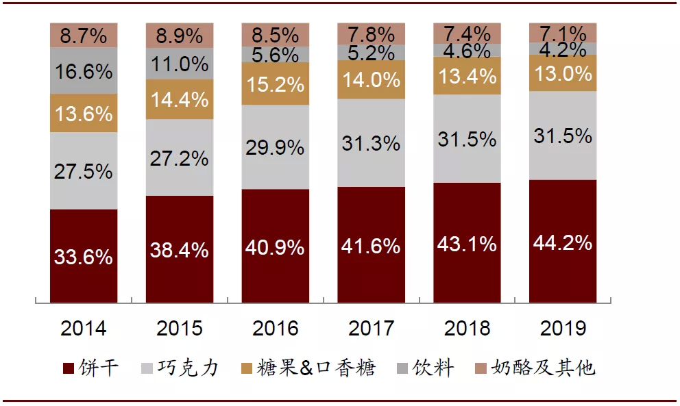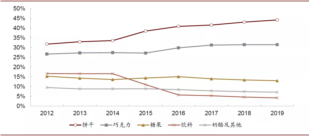 图表: 亿滋国际2012-2019年各品类收入占比