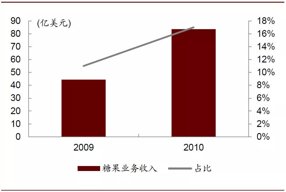 ——2010年收购吉百利(囊括怡口莲、荷氏、炫迈等),糖果业务规模扩大88%,全球市占率提升至13.5%