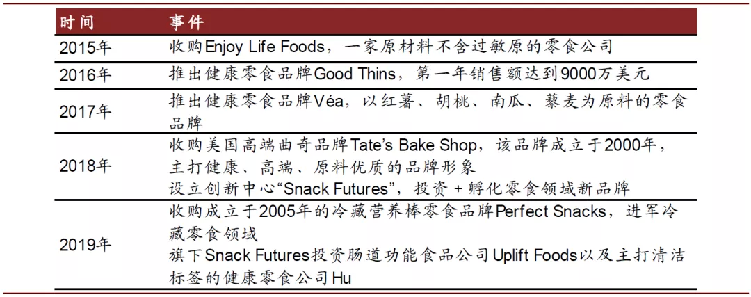 近年亿滋国际调整品牌策略,向高端化、差异化、健康化加码。公司开始并购一些“小而美”的公司,包括健康食品品牌、中高端品牌等等,进一步丰富产品结构的同时切入新领域。2015年亿滋国际收购了健康食品公司Enjoy Life Foods,2018年亿滋国际以5亿美元收购主打健康高端的曲奇品牌Tate’s Bake Shop,2019年公司收购冷藏营养棒的先驱品牌Perfect Snacks,开放多元、迎合潮流成为亿滋国际的品牌建设风格。