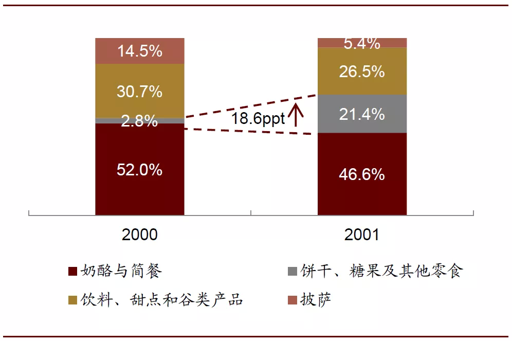 饼干成为卡夫食品的新业务以及营收占比15%的重要业务。收购前卡夫食品旗下零食业务中主要包括糖果等产品,没有饼干业务。完成对纳贝斯克的并购后,饼干成为了卡夫食品的新业务以及重要业务,2001年占总营收比重达15%。此次收购对公司收入及营业利润亦有增厚,公司总收入/营业利润从2000年的265.3/40.1亿美元提升至2001年的292.3/49.6亿美元,增厚10.2%/23.6%。而在北美本土市场,饼干、糖果和其他零食业务收入从2000年的5.6亿美元提升至2001年的46.8亿美元,扩容7倍以上,占北美总营收的比例也从2.8%迅速提升至21.4%。