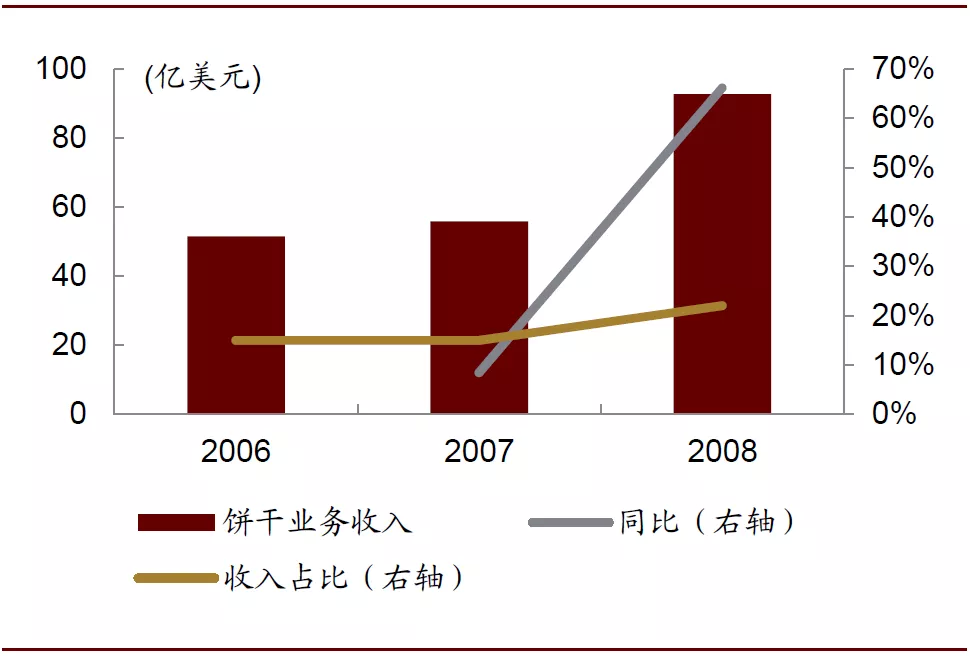 ——2007年收购达能旗下饼干业务(囊括达能、王子、闲趣等),饼干业务规模扩大70%,占营收比重提升至22%