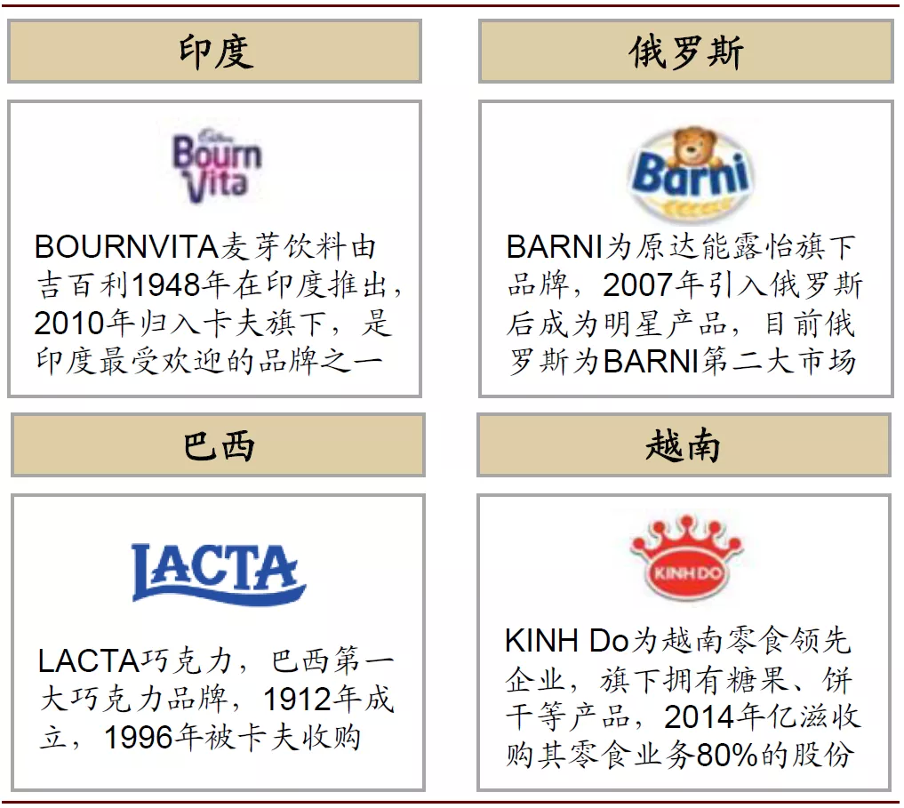 亿滋国际前身卡夫食品的历史包含着一部辉煌的并购史:2001年对纳贝斯克的并购为公司带来了奥利奥、趣多多和乐之等品牌,2007年对达能饼干业务的并购为公司带来了露怡、王子、闲趣、优冠等品牌,而2010年对吉百利的并购为公司带来了怡口莲、荷氏、清至等品牌。对全球优质企业的并购使得公司不断整合行业资源,扩充产品矩阵,拓宽销售渠道,进入新区域新市场以及快速提升份额,也是公司发展壮大、趋向多元化、成为全球零食领先企业的重要战略之一。
