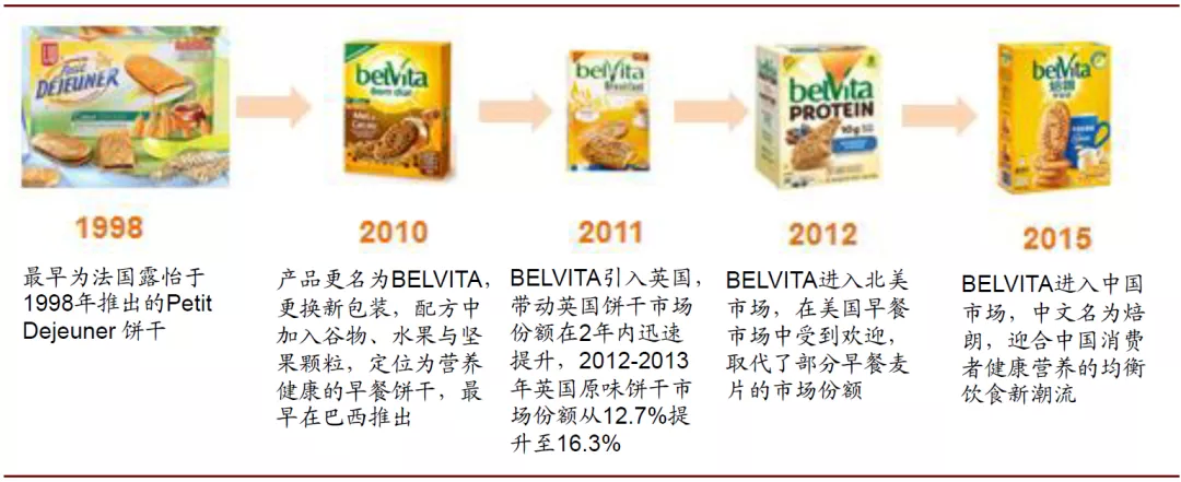 区域品牌多地打造案例:焙朗案例分析。焙朗的前身是1998年法国达能旗下的露怡饼干推出的Petit Dejeuner 饼干,2000年仅在7个欧洲国家售卖,品牌规模较小。2007年卡夫收购达能饼干业务后,充分挖掘产品的营养价值,迎合零食健康化潮流,并改良产品配方与包装,更名为焙朗(belVita)。2010年首先在巴西推出,2011-2015年相继引进英国、北美和中国并迅速收获消费者的喜爱和市场份额的提升。截至目前,焙朗已经成为亿滋旗下引领健康早餐饼干的全球性品牌,拥有20多个品种,并在50余个国家销售。
