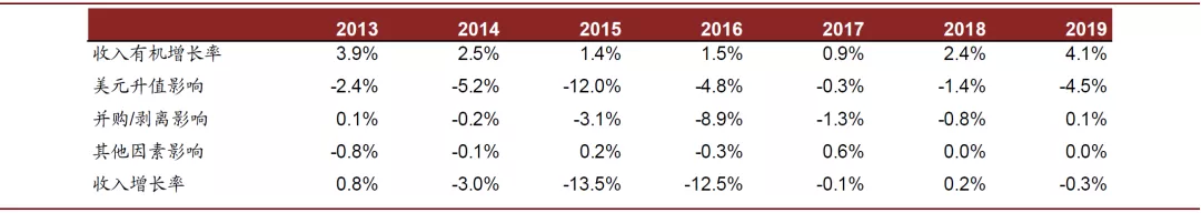 图表: 2013-2019年公司收入有机增长率与影响因素