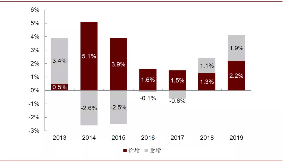 图表: 亿滋国际2013-2019年收入内生增长率中量增与价增贡献拆分