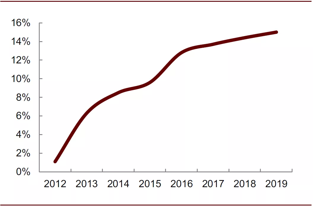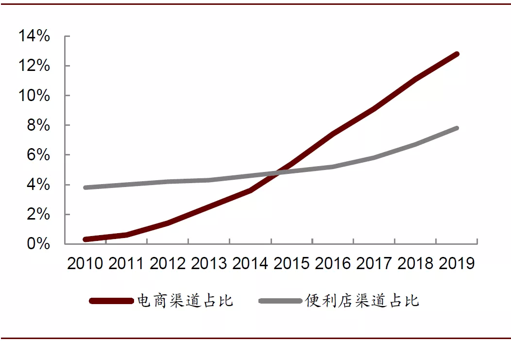 图表: 2010-2019年中国零食市场电商及便利店渠道占比
