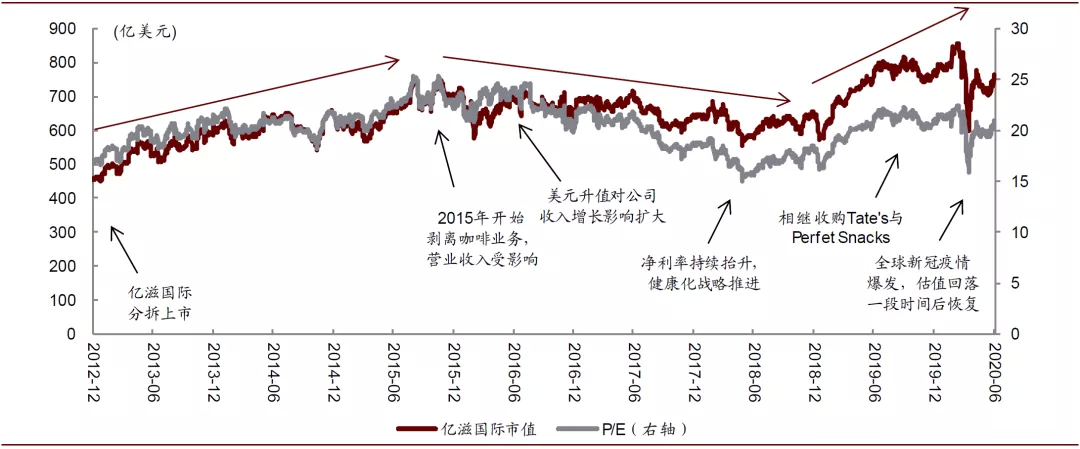 图表: 2012年至今亿滋国际市值与估值表现