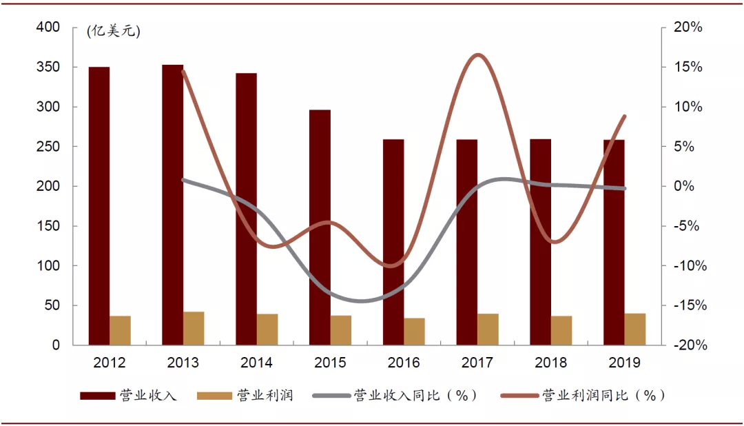 图表: 亿滋国际2012-2019年收入与营业利润情况