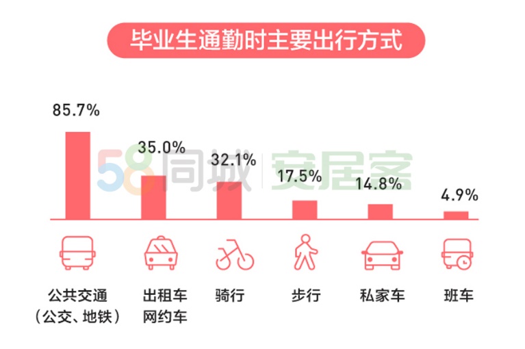 报告显示,对于通勤出行方式,85.7%的毕业生选择地铁公交等公共交通出行,出租、网约车、骑行方式占比均在30%以上。