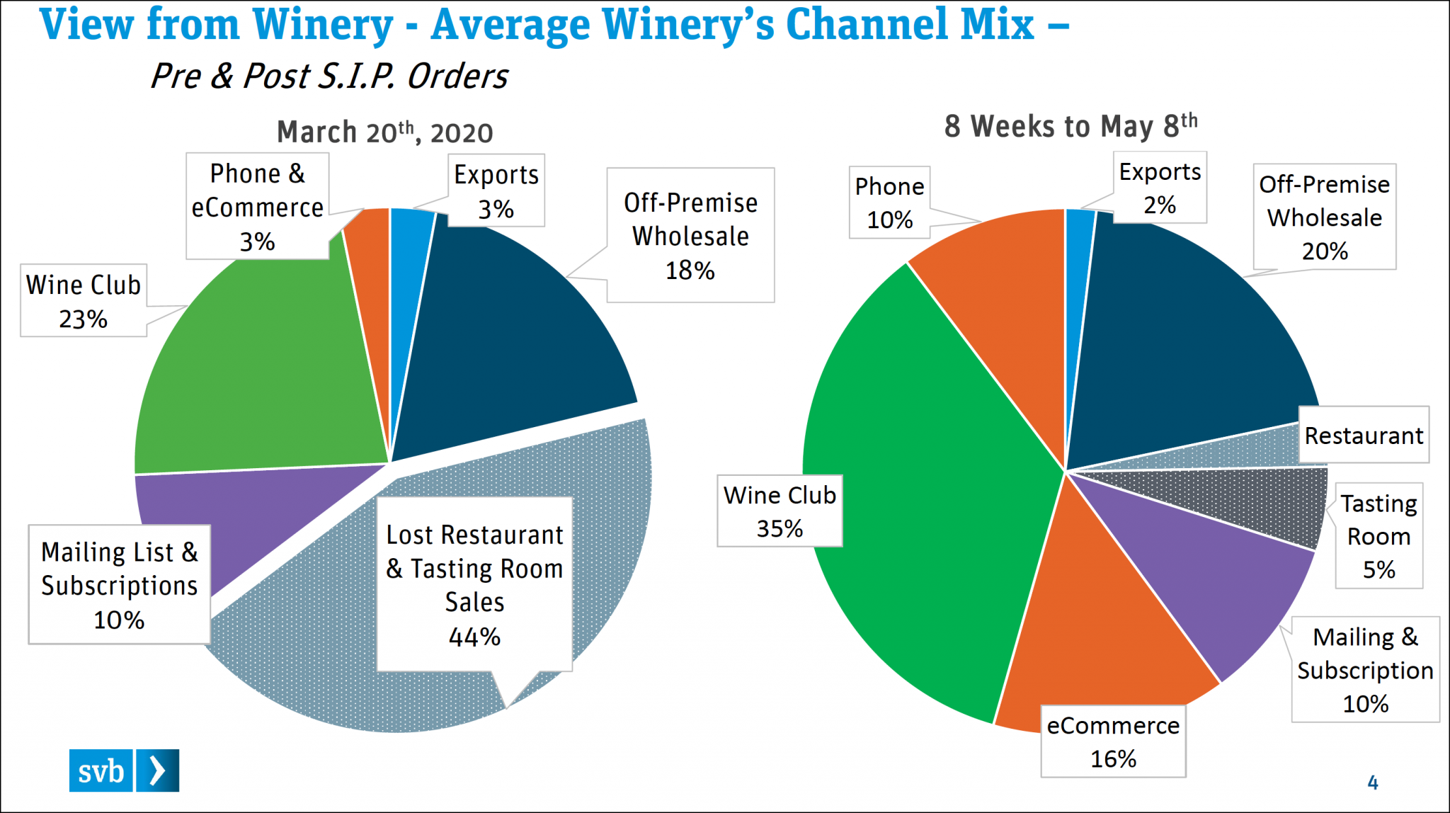 首先来分析一下疫情前和疫情后的数据对比,也许整体情况并没有我们想象的那么坏。根据硅谷银行的报告,2020年3月20日,在全美葡萄酒的销售渠道中,葡萄酒俱乐部占23%,店外批发占18%,邮寄和订阅占10%,电话销售及电商占3%,出口占3%,而餐厅和品酒室的销售一夜间失去了44%。此后的8周,占比发生巨大改变的是电商渠道,由此前不到3%的占比飙升至16%,葡萄酒俱乐部也有所增加,而餐厅葡萄酒销售并未完全消失,这可能归功于政府与餐厅老板的努力。比如,自3月中旬以来,加州便放宽了酒类销售规定,比如允许餐厅等将酒类以外带方式销售,以此帮助加州上万家受疫情影响的酒类企业。