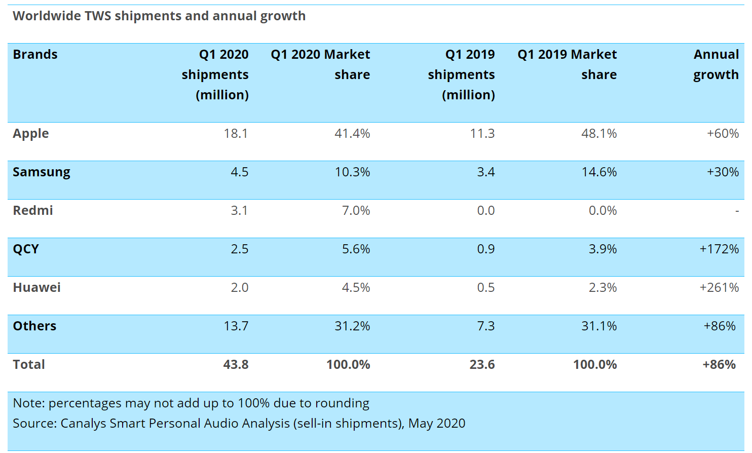 智能手机供应商苹果、三星和小米在2020年第一季度引领了TWS市场。Canalys Research分析师Cynthia Chen表示:“智能手机供应商迅速占据主导地位并不令人惊讶。市场领头羊苹果保持强劲势头。它的降噪AirPods Pro表现尤其出色,第一季度出货量为550万。Galaxy Buds+的发布,三星获得了提振,这款产品在音质和电池寿命方面都有所改善。尽管红米和QCY等中国公司利用其供应链能力在入门级市场占据主导地位,但华为以151美元的平均售价脱颖而出。这比三星145美元的价格要高,这要归功于华为旗舰产品FreeBuds 3。”