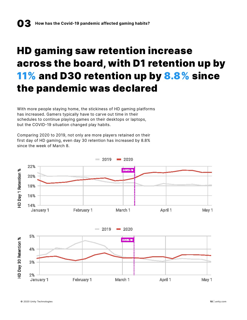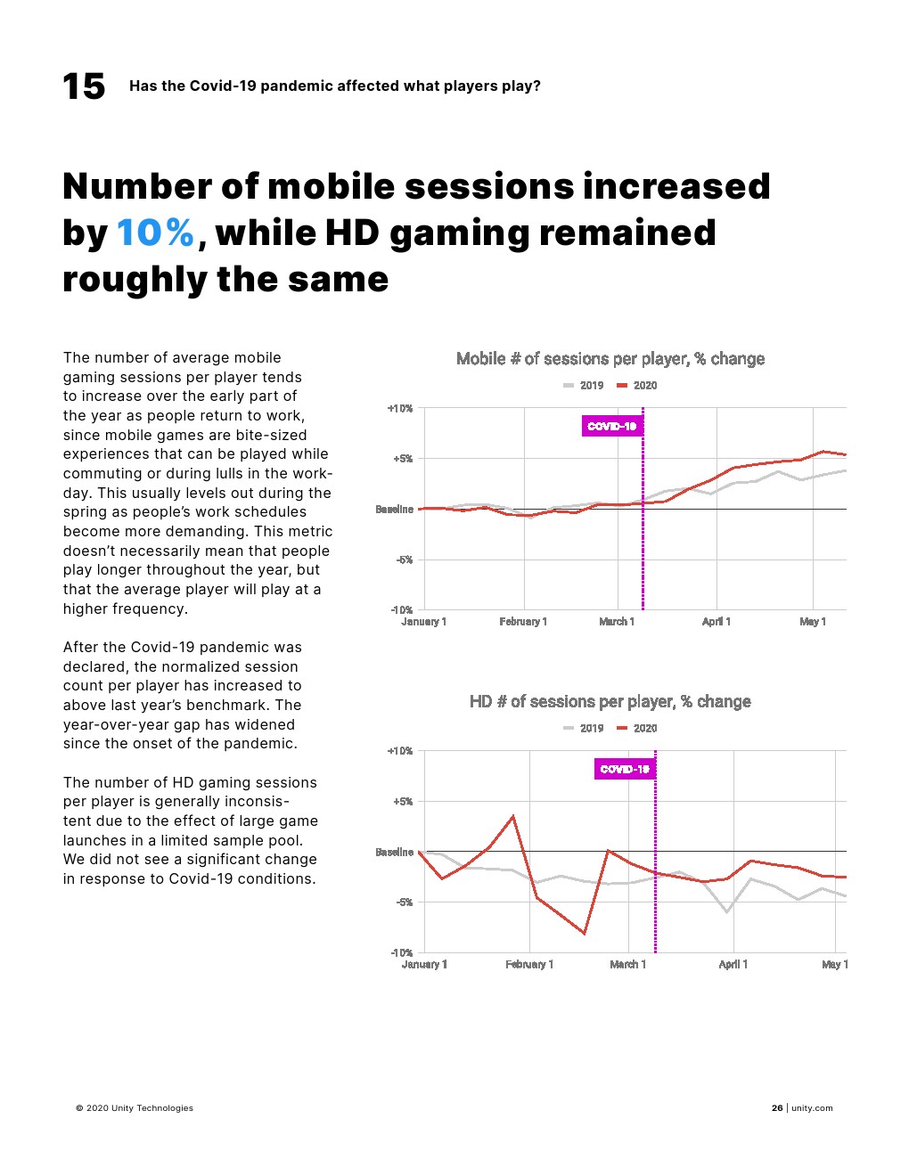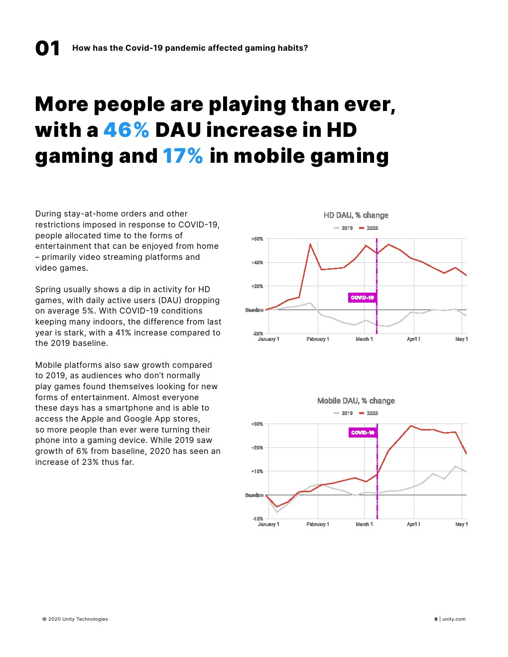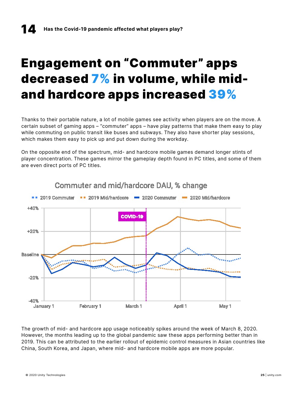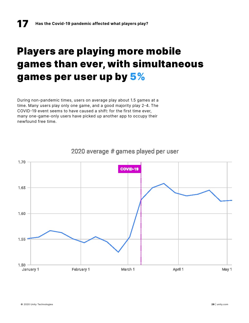 Unity的报告收集了使用其货币化平台的手机游戏以及用于PC、Mac OS、Android和iOS的Unity引擎制作的游戏的数据。它分析了来自DeltaDNA的参与数据。数据范围是从2019年到2020年,从年初到5月中旬。