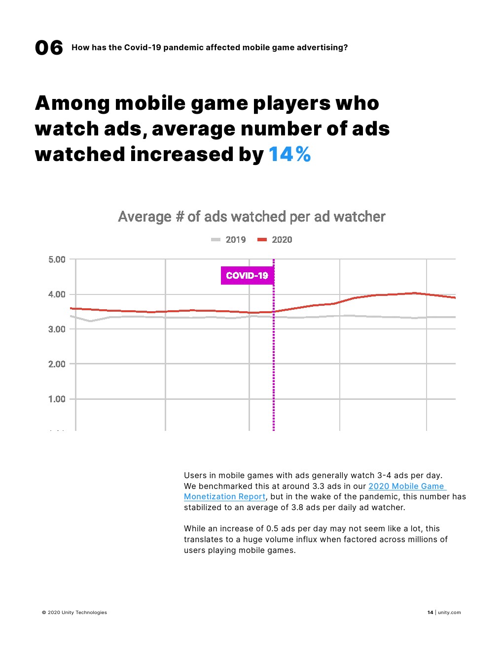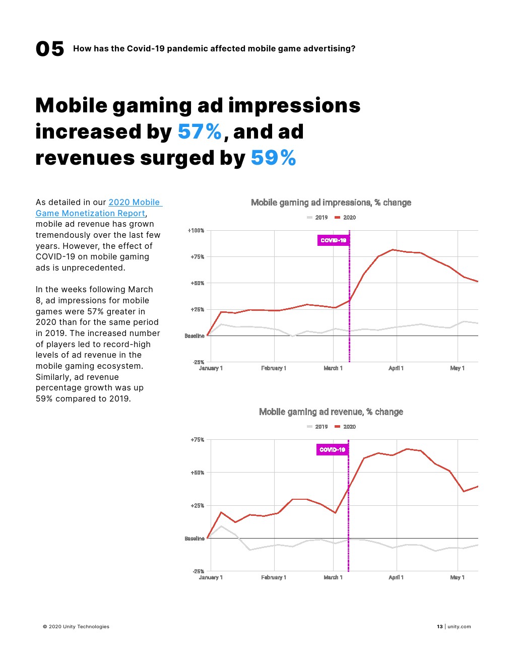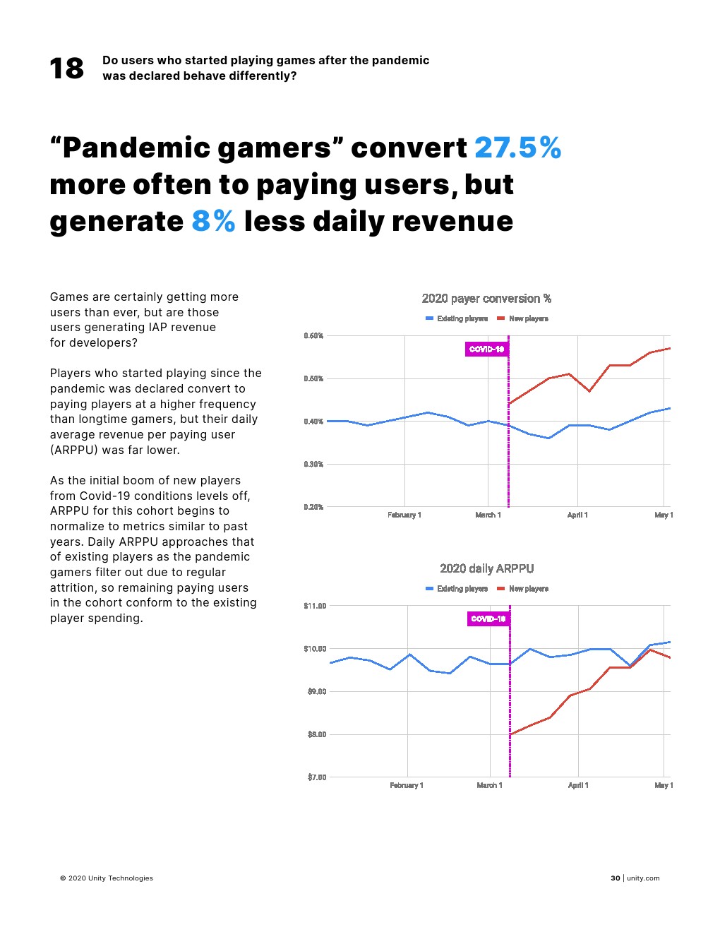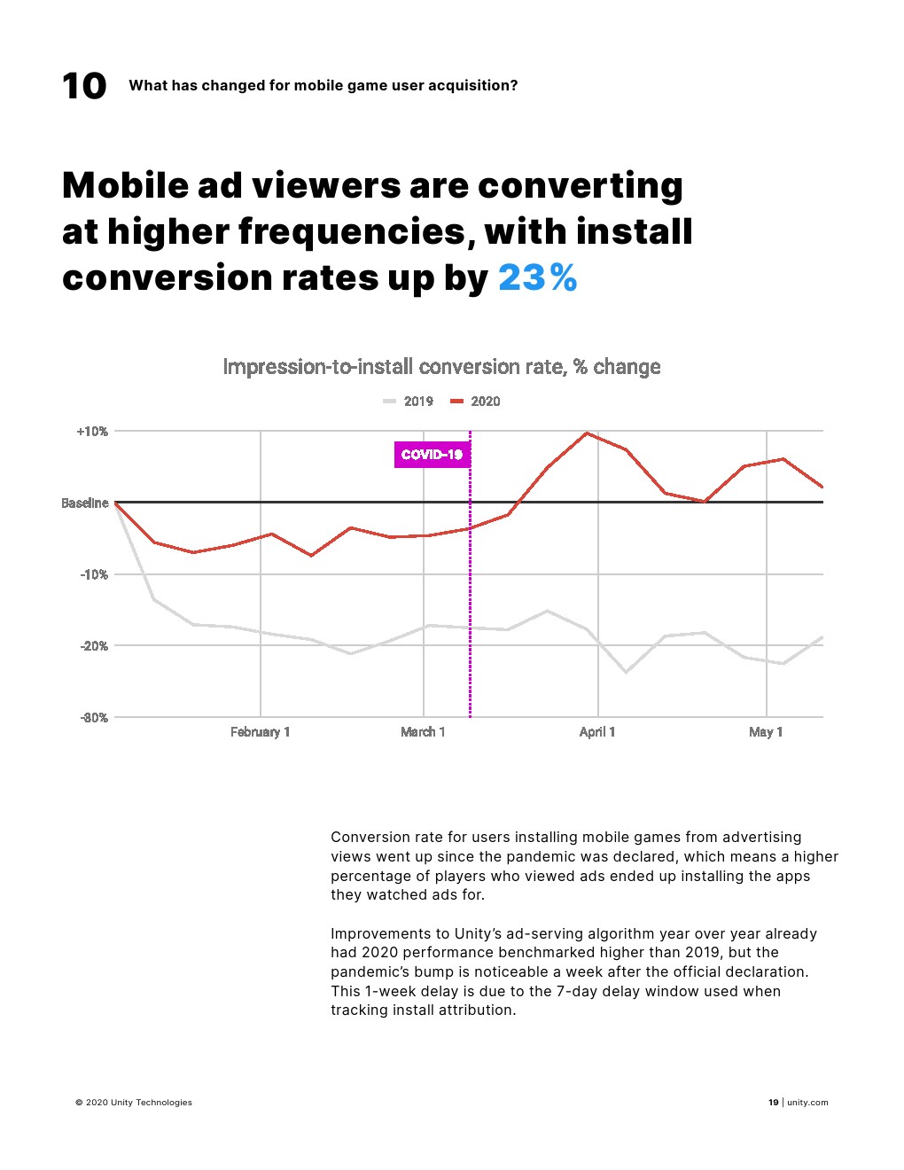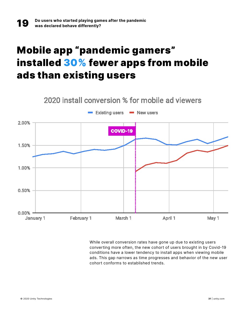 Unity的报告收集了使用其货币化平台的手机游戏以及用于PC、Mac OS、Android和iOS的Unity引擎制作的游戏的数据。它分析了来自DeltaDNA的参与数据。数据范围是从2019年到2020年,从年初到5月中旬。